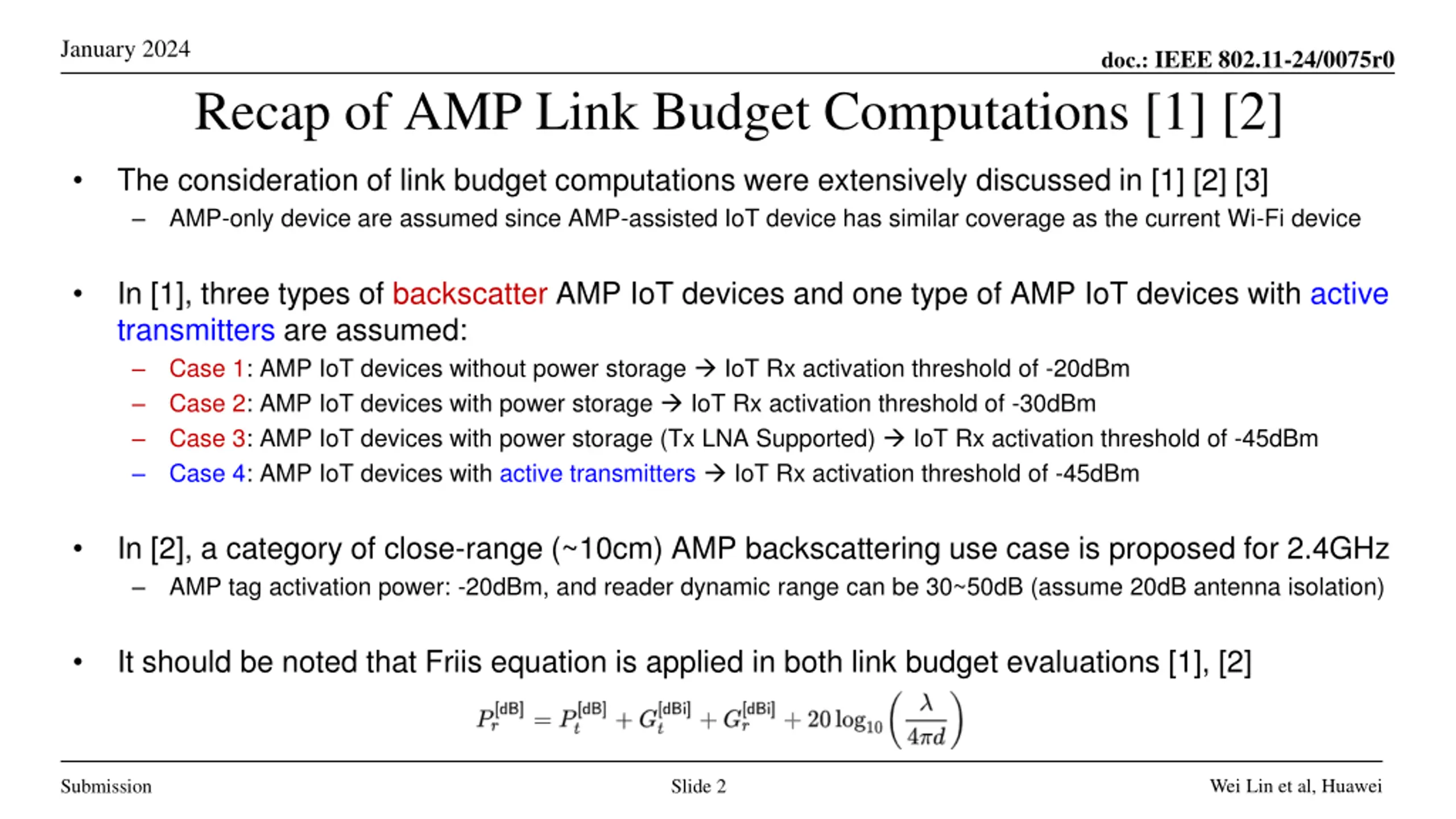January 2024 doc.: IEEE 802.11-24/0075r0 Recap of AMP Link Budget Computations [1] [2] The consideration of link budget computations were extensively discussed in [1] [2] [3] AMP-only device are assumed since AMP-assisted IoT device has similar coverage as the current Wi-Fi device In [1], three types of backscatter AMP IoT devices and one type of AMP IoT devices with active transmitters are assumed: Case 1: AMP IoT devices without power storage IoT Rx activation threshold of -20dBm Case 2: AMP IoT devices with power storage IoT Rx activation threshold of -30dBm Case 3: AMP IoT devices with power storage (Tx LNA Supported) IoT Rx activation threshold of -45dBm Case 4: AMP IoT devices with active transmitters IoT Rx activation threshold of -45dBm In [2], a category of close-range (~10cm) AMP backscattering use case is proposed for 2.4GHz AMP tag activation power: -20dBm, and reader dynamic range can be 30~50dB (assume 20dB antenna isolation) It should be noted that Friis equation is applied in both link budget evaluations [1], [2] Wei Lin et al, Huawei Submission Slide 2