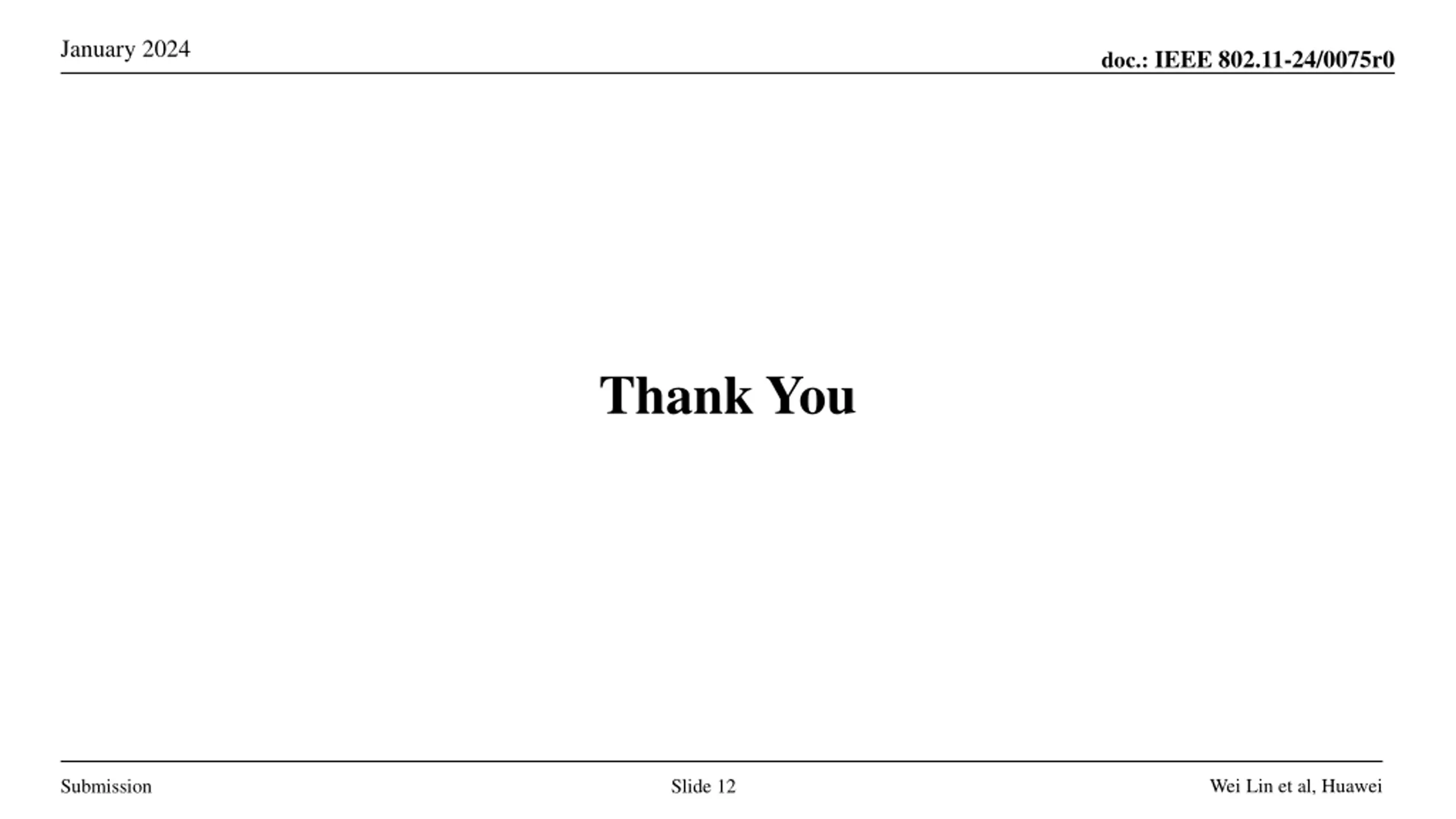 January 2024 doc.: IEEE 802.11-24/0075r0 Thank You Wei Lin et al, Huawei Submission Slide 12