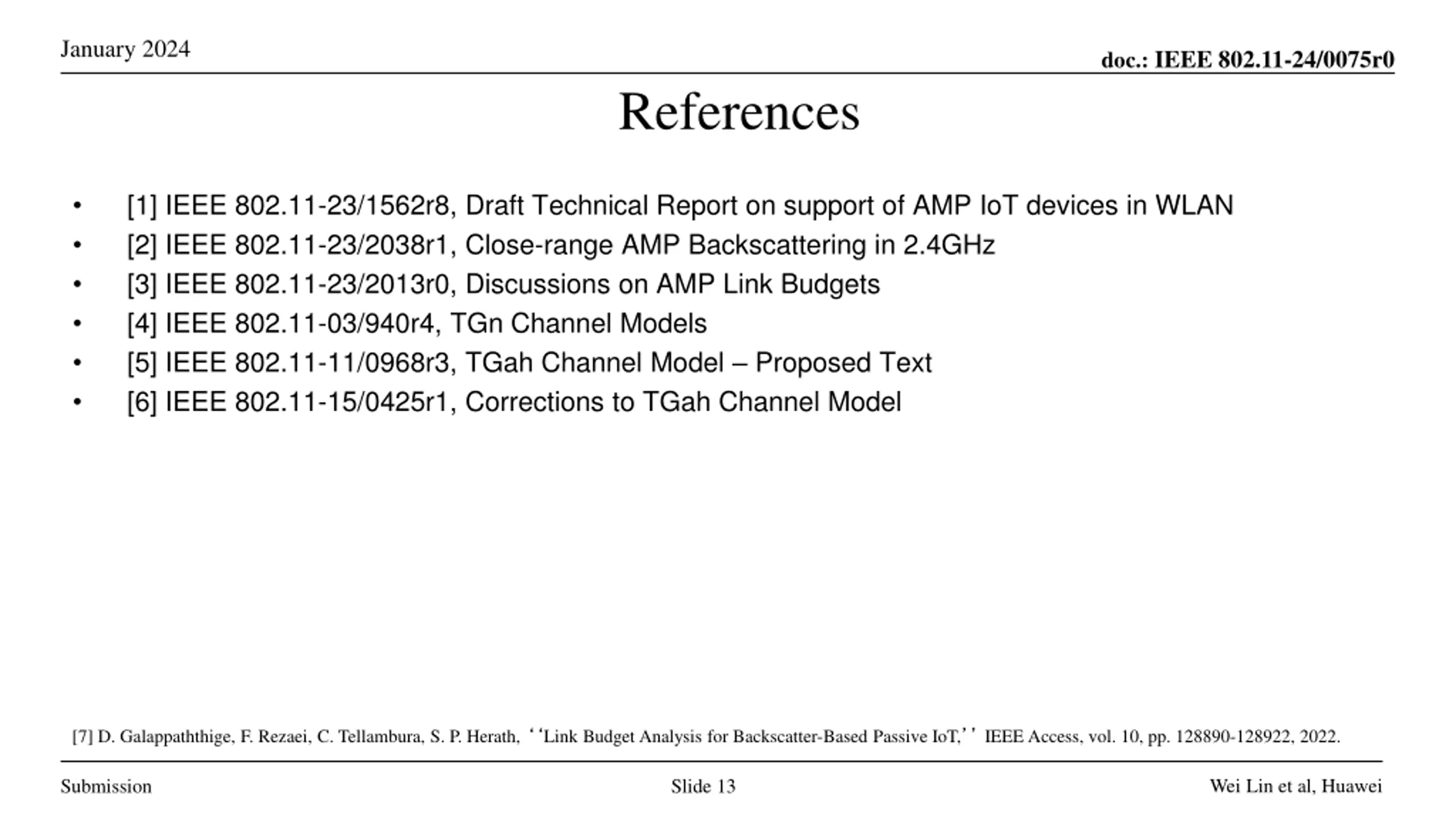 January 2024 doc.: IEEE 802.11-24/0075r0 References [1] IEEE 802.11-23/1562r8, Draft Technical Report on support of AMP IoT devices in WLAN [2] IEEE 802.11-23/2038r1, Close-range AMP Backscattering in 2.4GHz [3] IEEE 802.11-23/2013r0, Discussions on AMP Link Budgets [4] IEEE 802.11-03/940r4, TGn Channel Models [5] IEEE 802.11-11/0968r3, TGah Channel Model Proposed Text [6] IEEE 802.11-15/0425r1, Corrections to TGah Channel Model [7] D. Galappaththige, F. Rezaei, C. Tellambura, S. P. Herath, Link Budget Analysis for Backscatter-Based Passive IoT, IEEE Access, vol. 10, pp. 128890-128922, 2022. Wei Lin et al, Huawei Submission Slide 13
