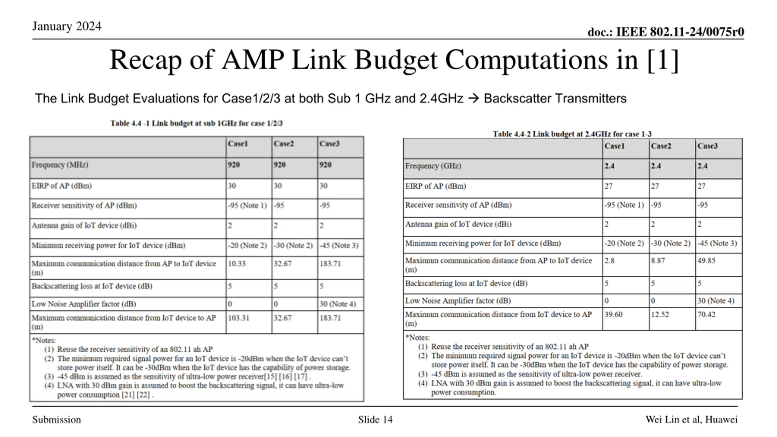 January 2024 doc.: IEEE 802.11-24/0075r0 Recap of AMP Link Budget Computations in [1] The Link Budget Evaluations for Case1/2/3 at both Sub 1 GHz and 2.4GHz Backscatter Transmitters Wei Lin et al, Huawei Submission Slide 14