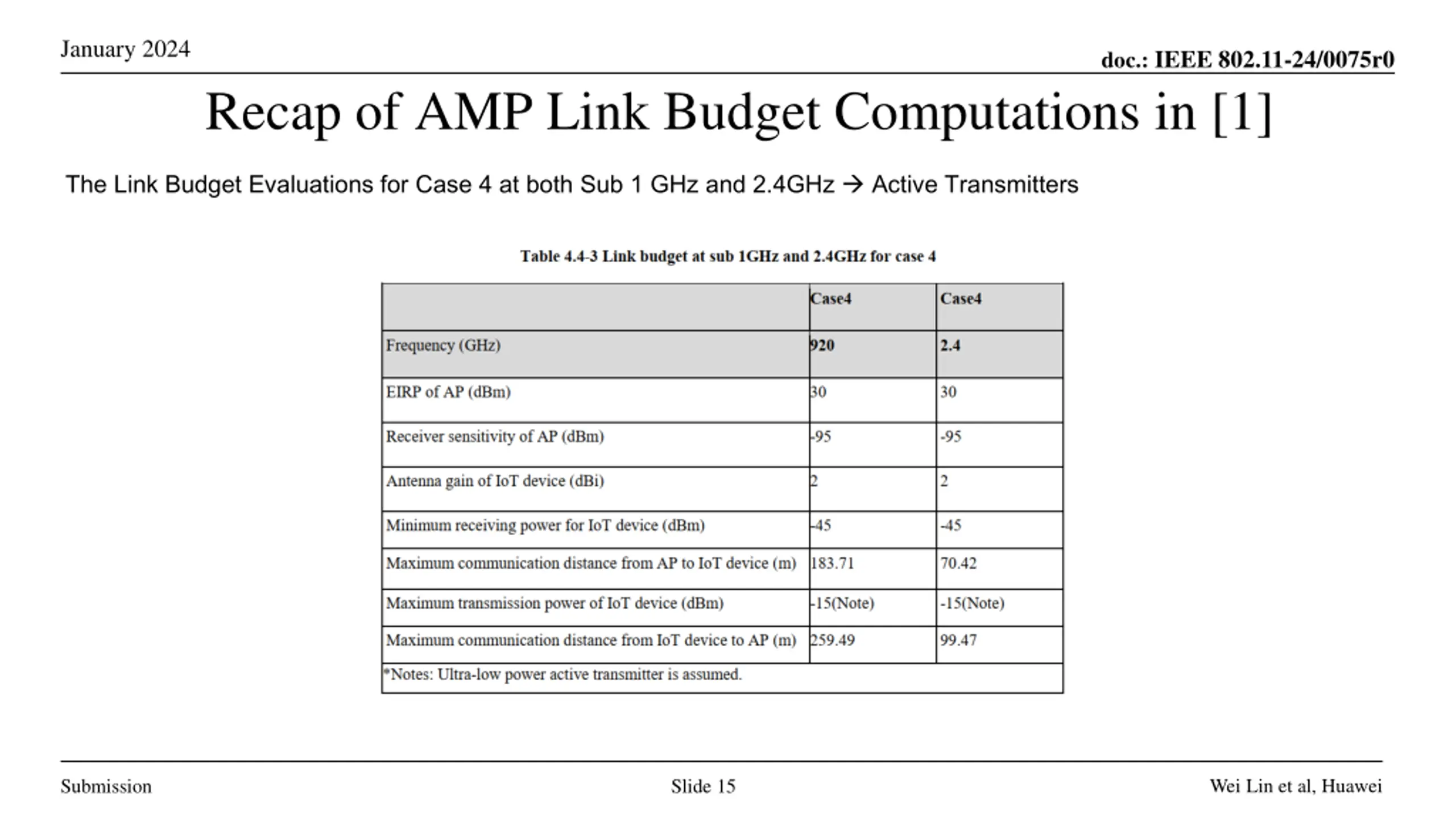 January 2024 doc.: IEEE 802.11-24/0075r0 Recap of AMP Link Budget Computations in [1] The Link Budget Evaluations for Case 4 at both Sub 1 GHz and 2.4GHz Active Transmitters Wei Lin et al, Huawei Submission Slide 15