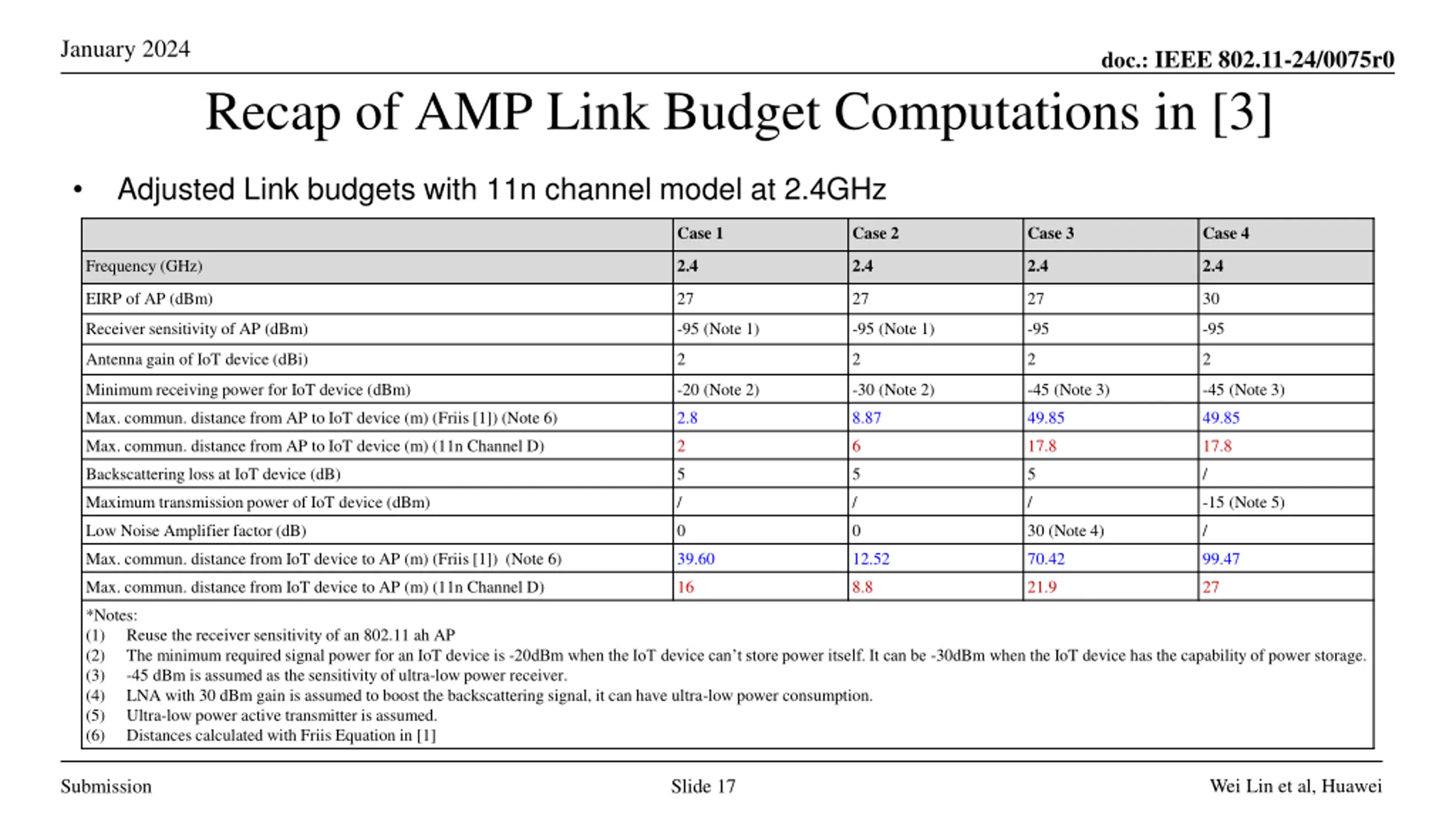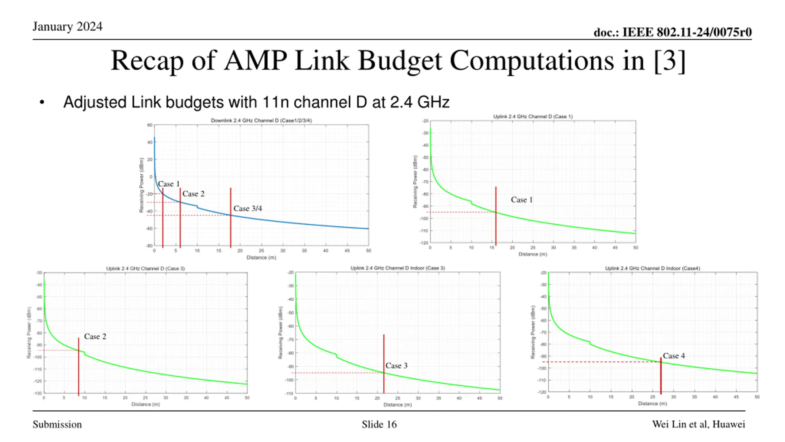 January 2024 doc.: IEEE 802.11-24/0075r0 Recap of AMP Link Budget Computations in [3] Adjusted Link budgets with 11n channel D at 2.4 GHz Case 1 Case 2 Case 1 Case 3/4 Case 2 Case 4 Case 3 Wei Lin et al, Huawei Submission Slide 16