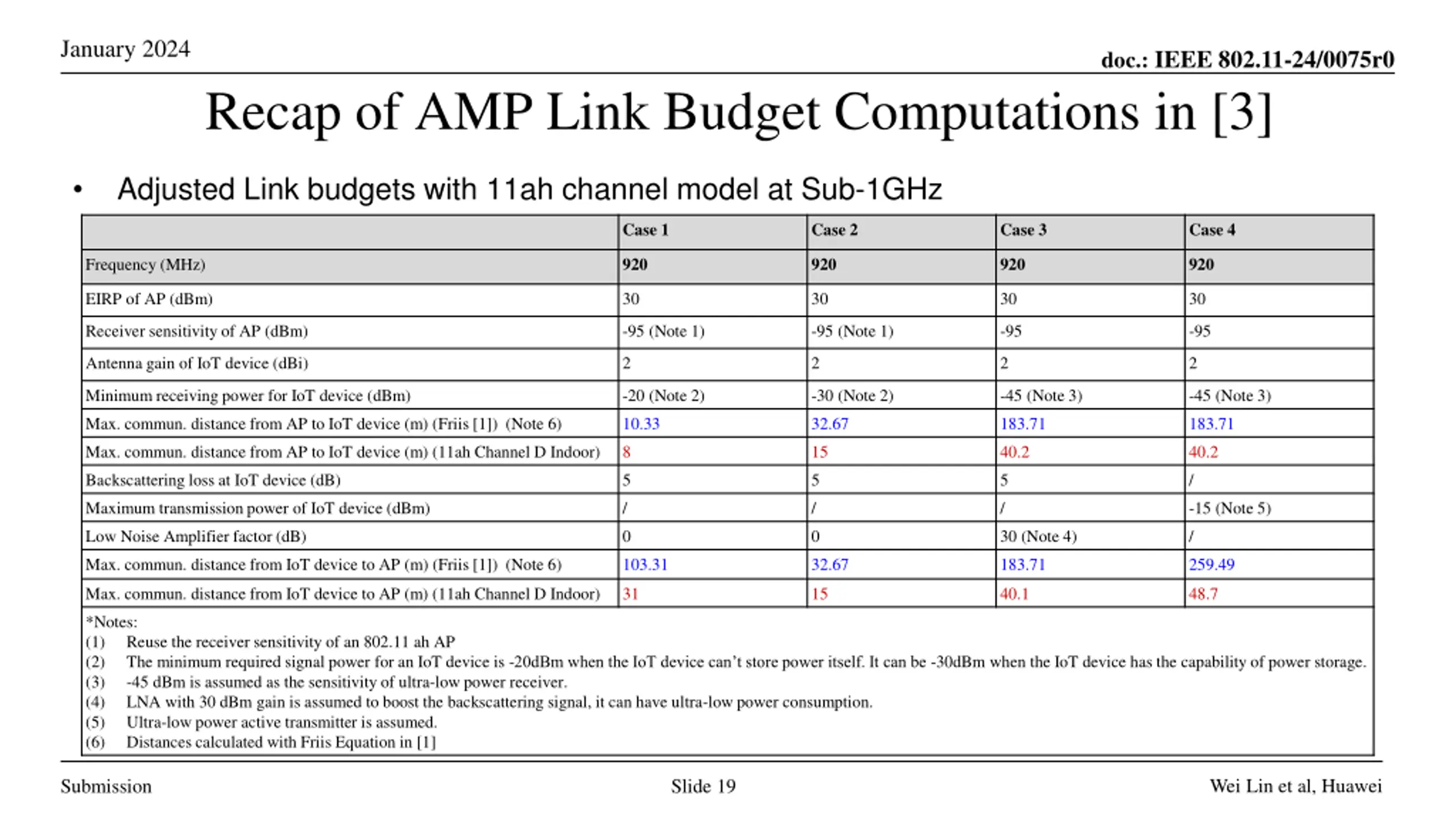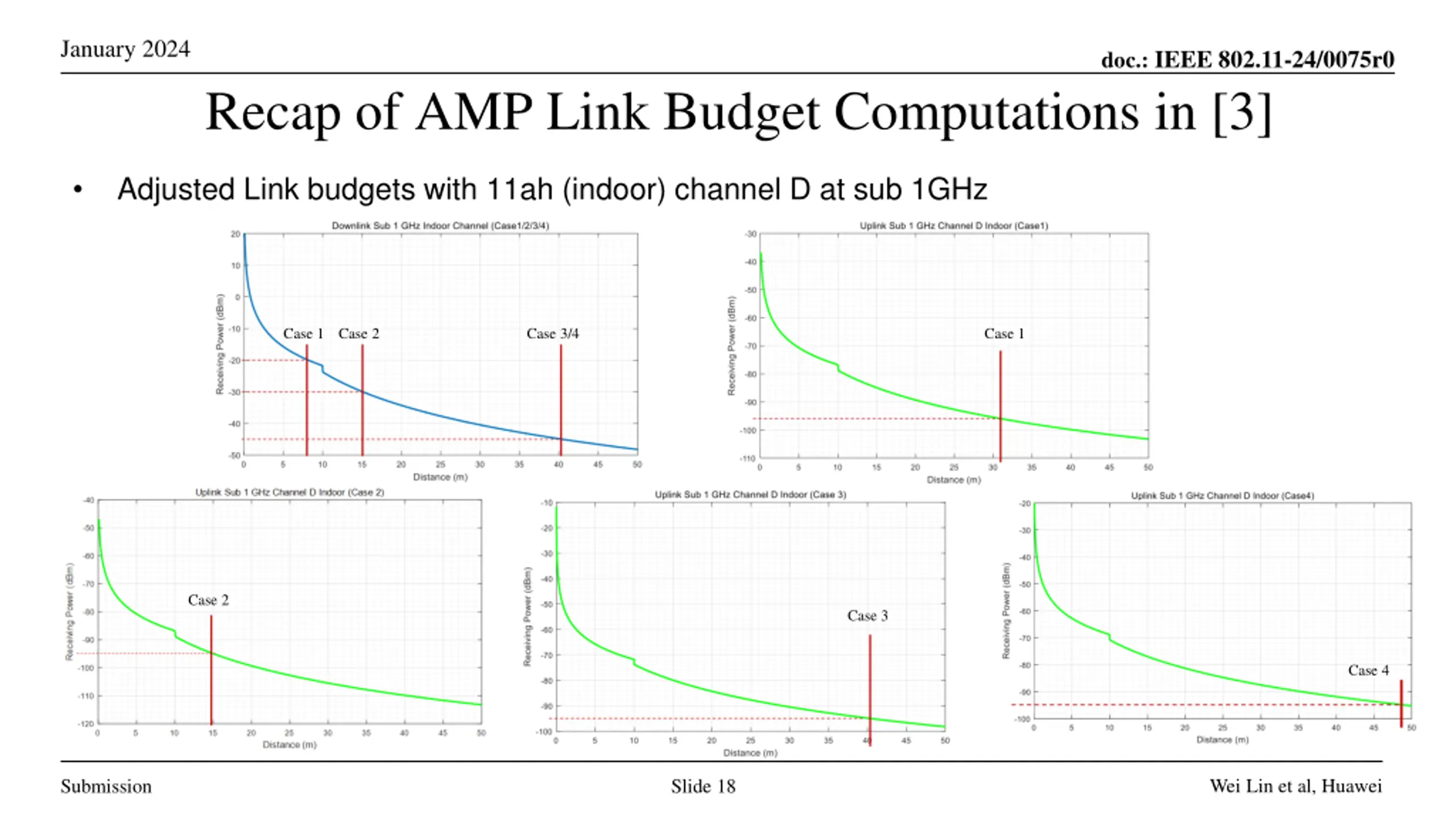January 2024 doc.: IEEE 802.11-24/0075r0 Recap of AMP Link Budget Computations in [3] Adjusted Link budgets with 11ah (indoor) channel D at sub 1GHz Case 1 Case 2 Case 3/4 Case 1 Case 2 Case 3 Case 4 Wei Lin et al, Huawei Submission Slide 18