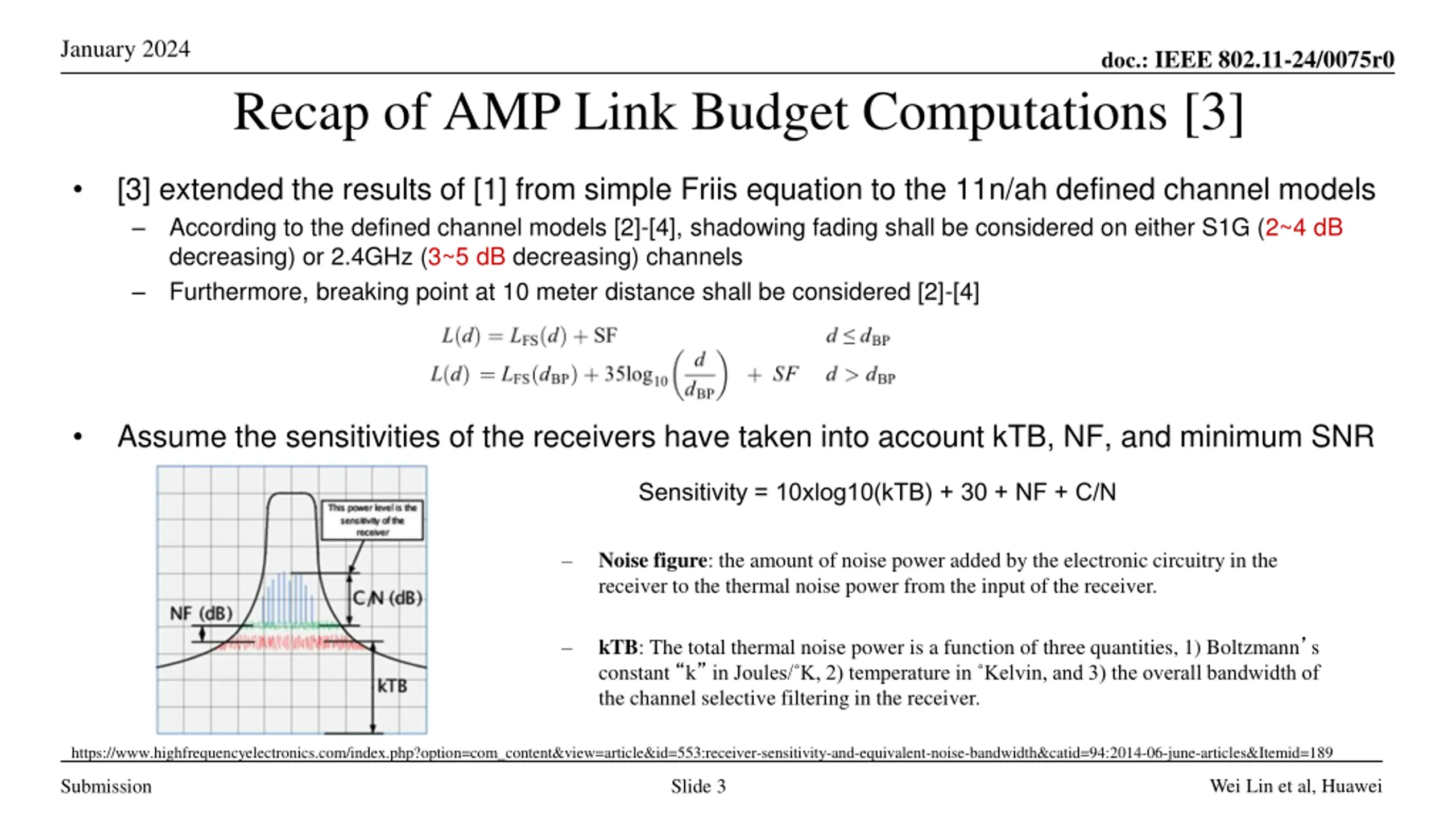 January 2024 doc.: IEEE 802.11-24/0075r0 Recap of AMP Link Budget Computations [3] [3] extended the results of [1] from simple Friis equation to the 11n/ah defined channel models According to the defined channel models [2]-[4], shadowing fading shall be considered on either S1G (2~4 dB decreasing) or 2.4GHz (3~5 dB decreasing) channels Furthermore, breaking point at 10 meter distance shall be considered [2]-[4] Assume the sensitivities of the receivers have taken into account kTB, NF, and minimum SNR Sensitivity = 10xlog10(kTB) + 30 + NF + C/N Noise figure: the amount of noise power added by the electronic circuitry in the receiver to the thermal noise power from the input of the receiver. kTB: The total thermal noise power is a function of three quantities, 1) Boltzmann s constant k in Joules/ K, 2) temperature in Kelvin, and 3) the overall bandwidth of the channel selective filtering in the receiver. https://www.highfrequencyelectronics.com/index.php?option=com_content&view=article&id=553:receiver-sensitivity-and-equivalent-noise-bandwidth&catid=94:2014-06-june-articles&Itemid=189 Wei Lin et al, Huawei Submission Slide 3