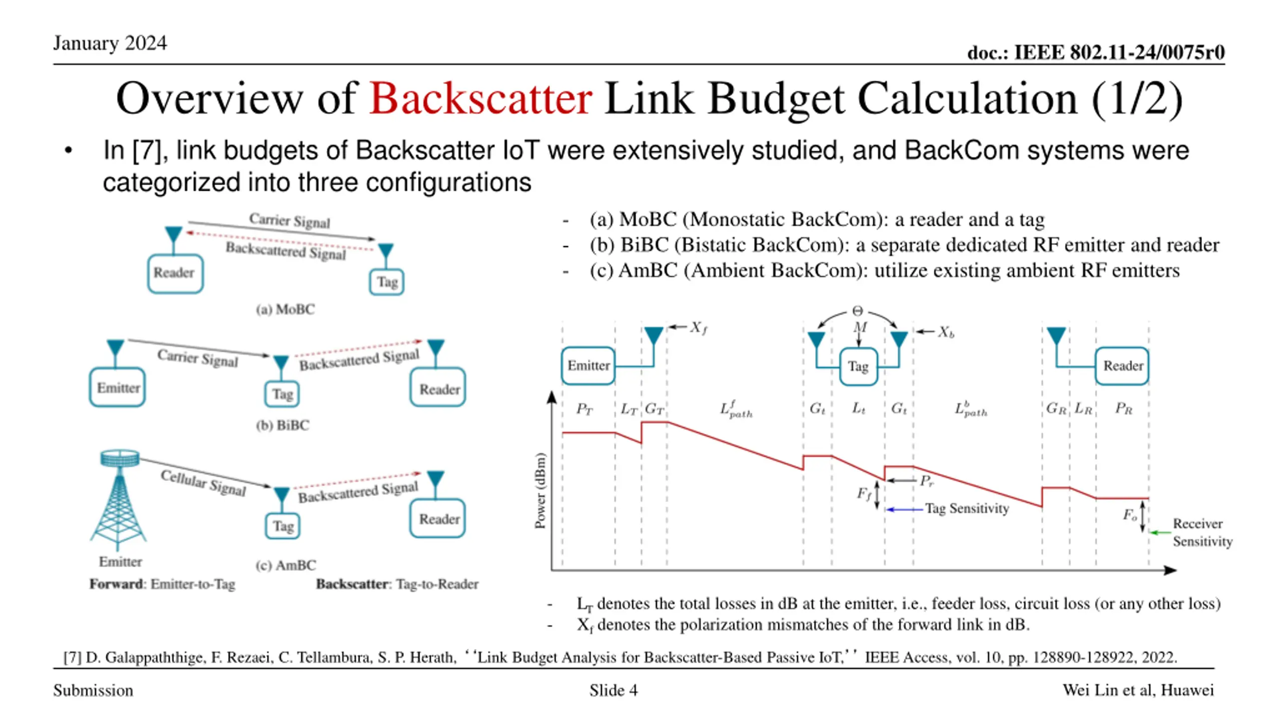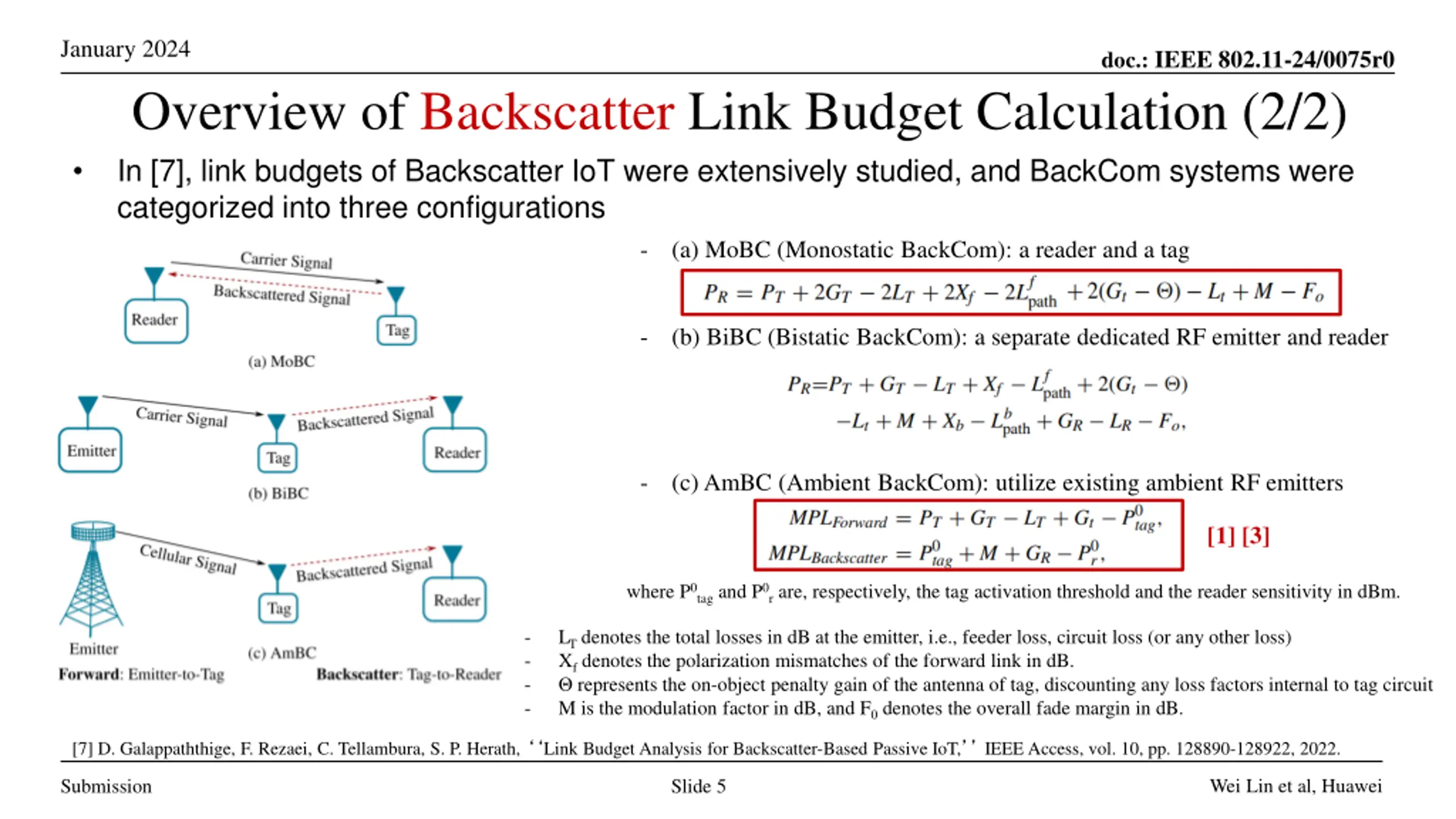 January 2024 doc.: IEEE 802.11-24/0075r0 Overview of Backscatter Link Budget Calculation (1/2) In [7], link budgets of Backscatter IoT were extensively studied, and BackCom systems were categorized into three configurations - (a) MoBC (Monostatic BackCom): a reader and a tag - (b) BiBC (Bistatic BackCom): a separate dedicated RF emitter and reader - (c) AmBC (Ambient BackCom): utilize existing ambient RF emitters - - - LTdenotes the total losses in dB at the emitter, i.e., feeder loss, circuit loss (or any other loss) Xfdenotes the polarization mismatches of the forward link in dB. [7] D. Galappaththige, F. Rezaei, C. Tellambura, S. P. Herath, Link Budget Analysis for Backscatter-Based Passive IoT, IEEE Access, vol. 10, pp. 128890-128922, 2022. Wei Lin et al, Huawei Submission Slide 4