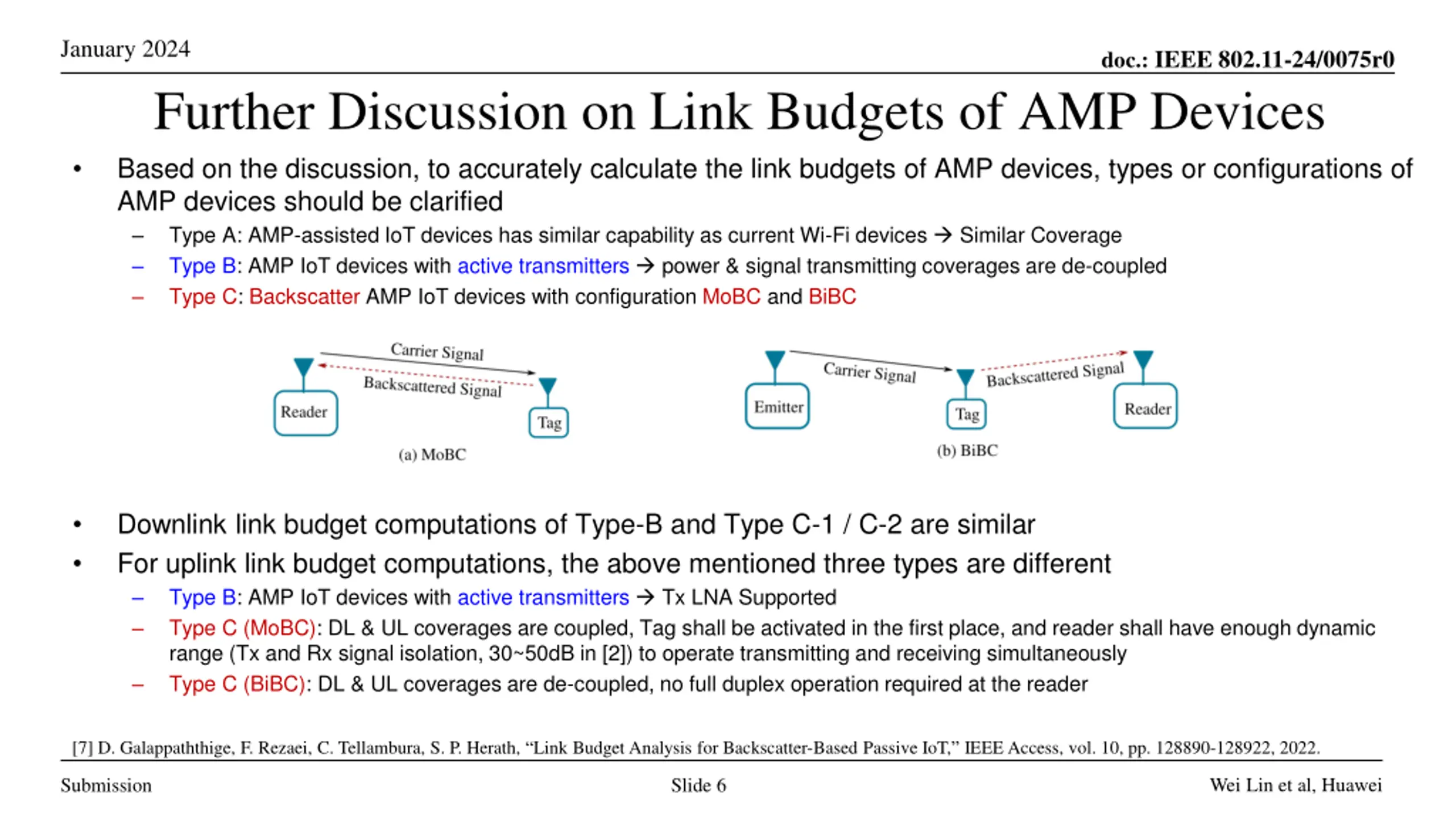 January 2024 doc.: IEEE 802.11-24/0075r0 Further Discussion on Link Budgets of AMP Devices Based on the discussion, to accurately calculate the link budgets of AMP devices, types or configurations of AMP devices should be clarified Type A: AMP-assisted IoT devices has similar capability as current Wi-Fi devices Similar Coverage Type B: AMP IoT devices with active transmitters power & signal transmitting coverages are de-coupled Type C: Backscatter AMP IoT devices with configuration MoBC and BiBC Downlink link budget computations of Type-B and Type C-1 / C-2 are similar For uplink link budget computations, the above mentioned three types are different Type B: AMP IoT devices with active transmitters Tx LNA Supported Type C (MoBC): DL & UL coverages are coupled, Tag shall be activated in the first place, and reader shall have enough dynamic range (Tx and Rx signal isolation, 30~50dB in [2]) to operate transmitting and receiving simultaneously Type C (BiBC): DL & UL coverages are de-coupled, no full duplex operation required at the reader [7] D. Galappaththige, F. Rezaei, C. Tellambura, S. P. Herath, Link Budget Analysis for Backscatter-Based Passive IoT, IEEE Access, vol. 10, pp. 128890-128922, 2022. Wei Lin et al, Huawei Submission Slide 6
