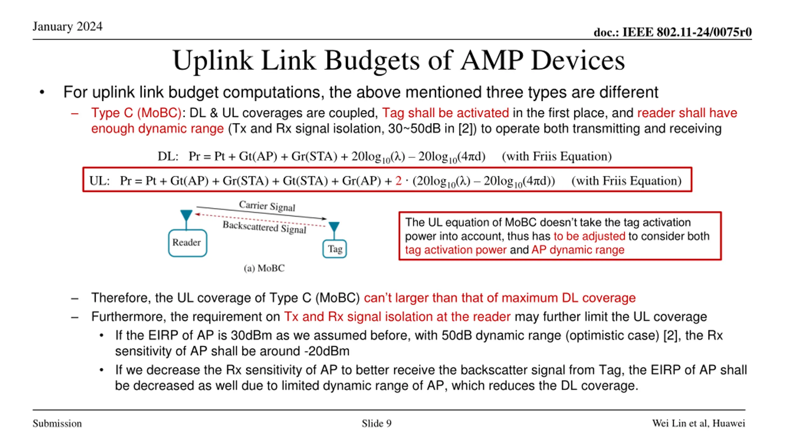 January 2024 doc.: IEEE 802.11-24/0075r0 Uplink Link Budgets of AMP Devices For uplink link budget computations, the above mentioned three types are different Type C (MoBC): DL & UL coverages are coupled, Tag shall be activated in the first place, and reader shall have enough dynamic range (Tx and Rx signal isolation, 30~50dB in [2]) to operate both transmitting and receiving DL: Pr = Pt + Gt(AP) + Gr(STA) + 20log10( ) 20log10(4 d) (with Friis Equation) UL: Pr = Pt + Gt(AP) + Gr(STA) + Gt(STA) + Gr(AP) + 2 (20log10( ) 20log10(4 d)) (with Friis Equation) The UL equation of MoBC doesn t take the tag activation power into account, thus has to be adjusted to consider both tag activation power and AP dynamic range Therefore, the UL coverage of Type C (MoBC) can t larger than that of maximum DL coverage Furthermore, the requirement on Tx and Rx signal isolation at the reader may further limit the UL coverage If the EIRP of AP is 30dBm as we assumed before, with 50dB dynamic range (optimistic case) [2], theRx sensitivity of AP shall be around -20dBm If we decrease the Rx sensitivity of AP to better receive the backscatter signal from Tag, the EIRP of AP shall be decreased as well due to limited dynamic range of AP, which reduces the DL coverage. Wei Lin et al, Huawei Submission Slide 9