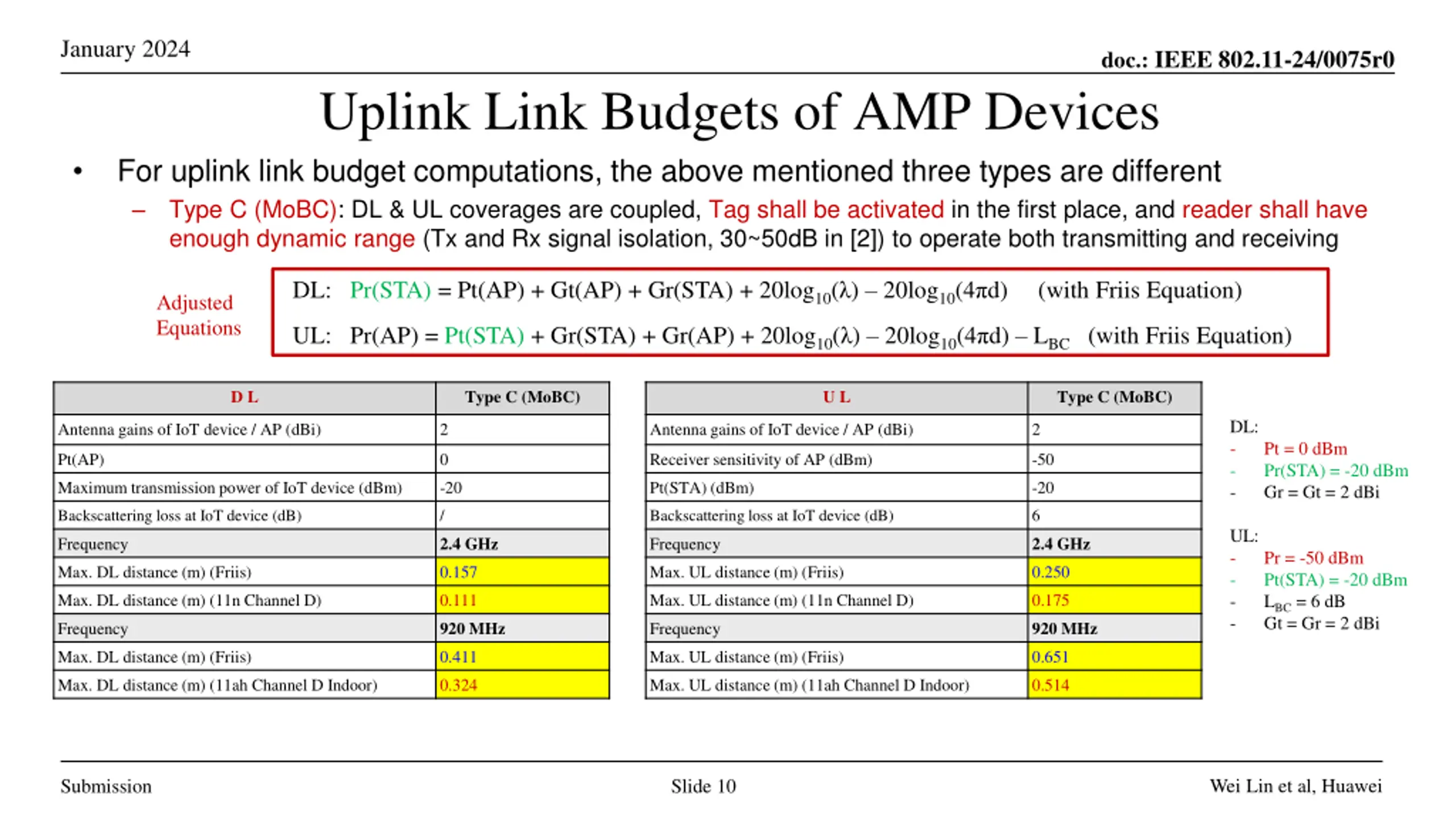 January 2024 doc.: IEEE 802.11-24/0075r0 Uplink Link Budgets of AMP Devices For uplink link budget computations, the above mentioned three types are different Type C (MoBC): DL & UL coverages are coupled, Tag shall be activated in the first place, and reader shall have enough dynamic range (Tx and Rx signal isolation, 30~50dB in [2]) to operate both transmitting and receiving DL: Pr(STA) = Pt(AP) + Gt(AP) + Gr(STA) + 20log10( ) 20log10(4 d) (with Friis Equation) Adjusted Equations UL: Pr(AP) = Pt(STA) + Gr(STA) + Gr(AP) + 20log10( ) 20log10(4 d) LBC (with Friis Equation) D L Type C (MoBC) U L Type C (MoBC) DL: - - - Antenna gains of IoT device / AP (dBi) 2 Antenna gains of IoT device / AP (dBi) 2 Pt = 0 dBm Pr(STA) = -20 dBm Gr = Gt = 2 dBi Pt(AP) 0 Receiver sensitivity of AP (dBm) -50 Maximum transmission power of IoT device (dBm) -20 Pt(STA) (dBm) -20 Backscattering loss at IoT device (dB) / Backscattering loss at IoT device (dB) 6 UL: - - - - 2.4 GHz 2.4 GHz Frequency Frequency Pr = -50 dBm Pt(STA) = -20 dBm LBC = 6 dB Gt = Gr = 2 dBi Max. DL distance (m) (Friis) 0.157 Max. UL distance (m) (Friis) 0.250 Max. DL distance (m) (11n Channel D) 0.111 Max. UL distance (m) (11n Channel D) 0.175 920 MHz 920 MHz Frequency Frequency Max. DL distance (m) (Friis) 0.411 Max. UL distance (m) (Friis) 0.651 Max. DL distance (m) (11ah Channel D Indoor) 0.324 Max. UL distance (m) (11ah Channel D Indoor) 0.514 Wei Lin et al, Huawei Submission Slide 10