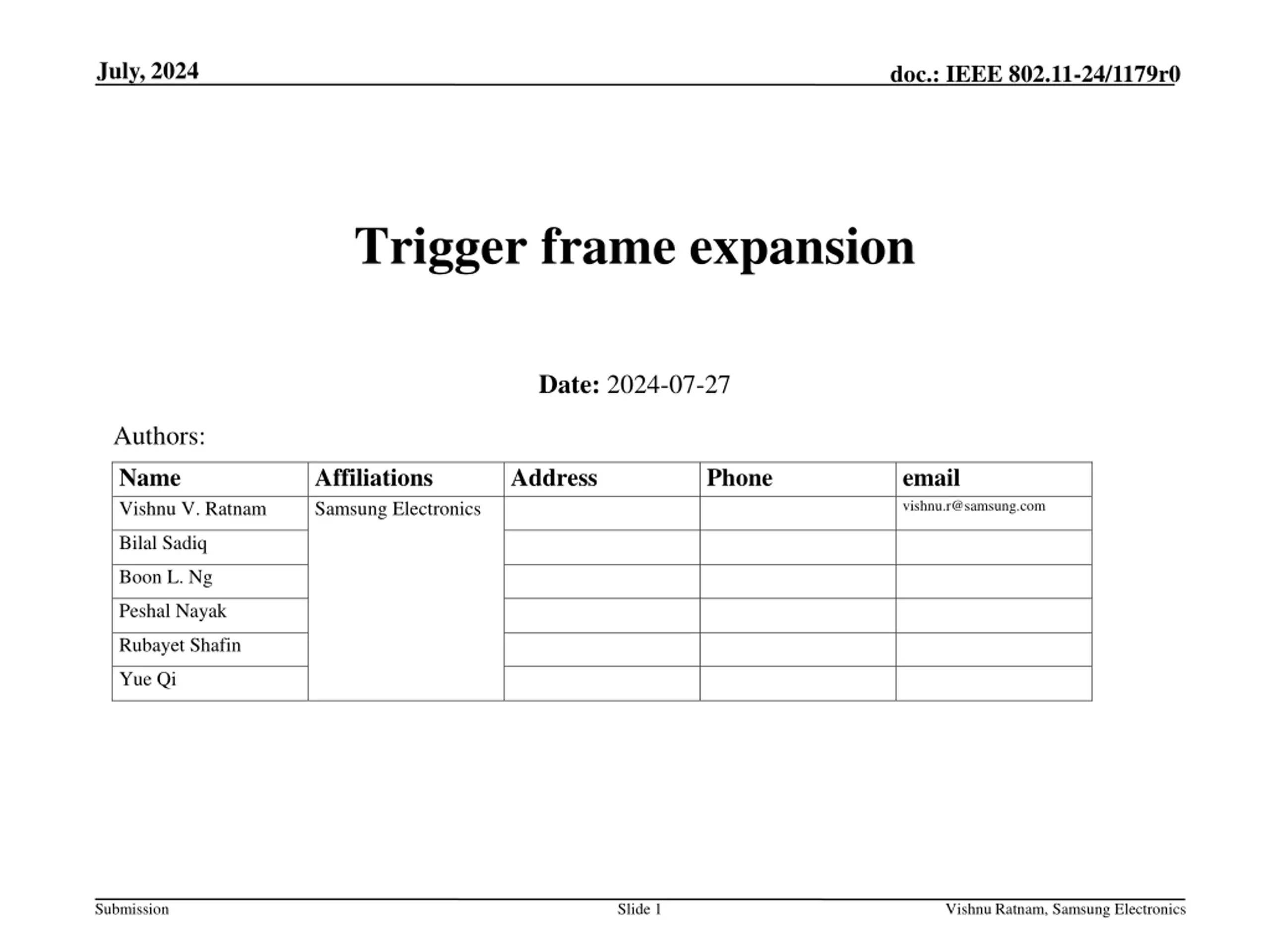 July, 2024 doc.: IEEE 802.11-24/1179r0 Trigger frame expansion Date: 2024-07-27 Authors: Name Vishnu V. Ratnam Affiliations Samsung Electronics Address Phone email vishnu.r@samsung.com Bilal Sadiq Boon L. Ng Peshal Nayak Rubayet Shafin Yue Qi Submission Slide 1 Vishnu Ratnam, Samsung Electronics
