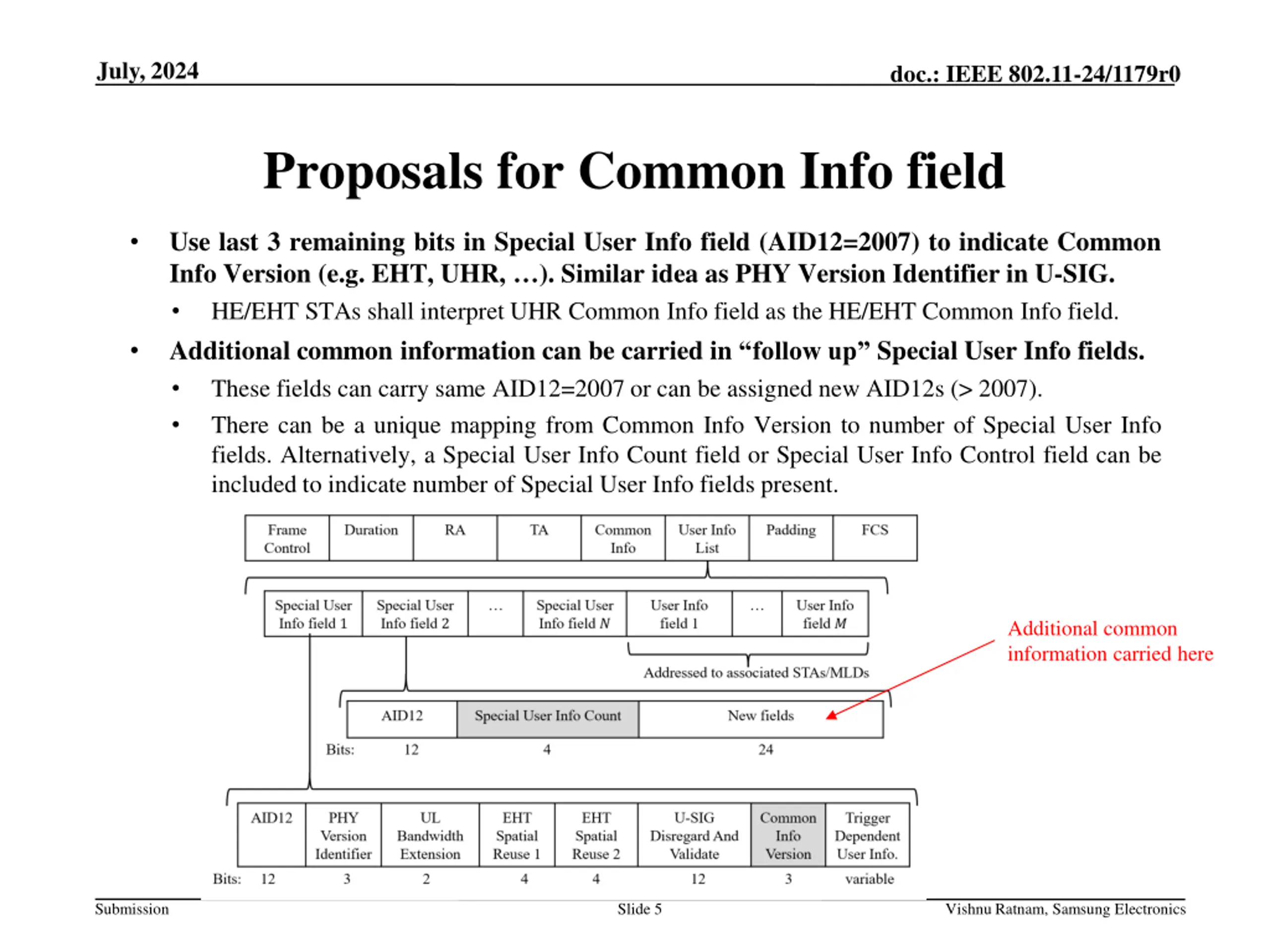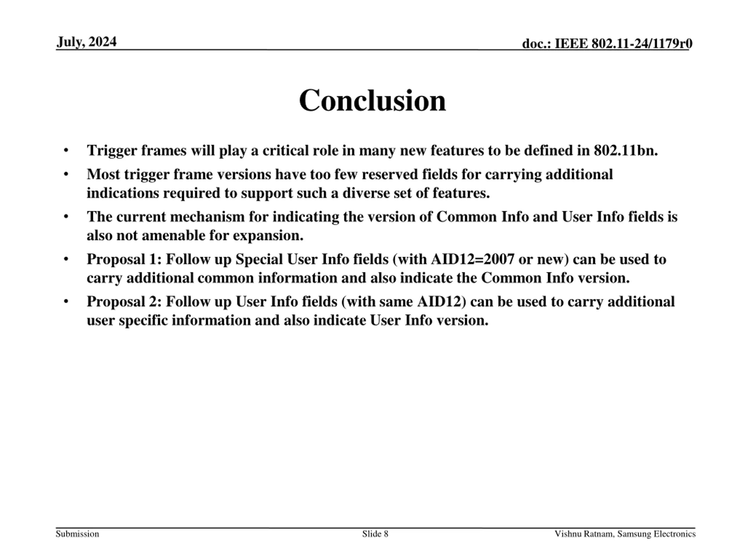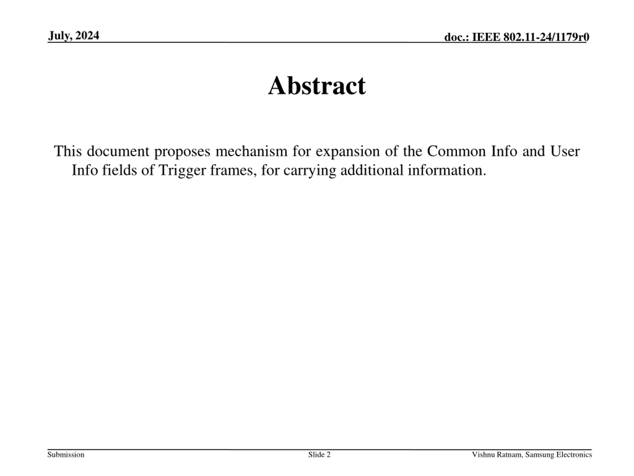 July, 2024 doc.: IEEE 802.11-24/1179r0 Abstract This document proposes mechanism for expansion of the Common Info and User Info fields of Trigger frames, for carrying additional information. Submission Slide 2 Vishnu Ratnam, Samsung Electronics