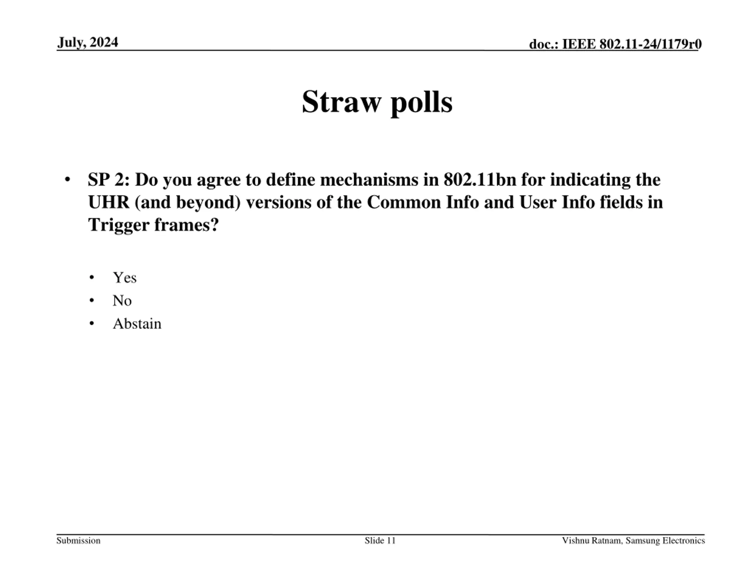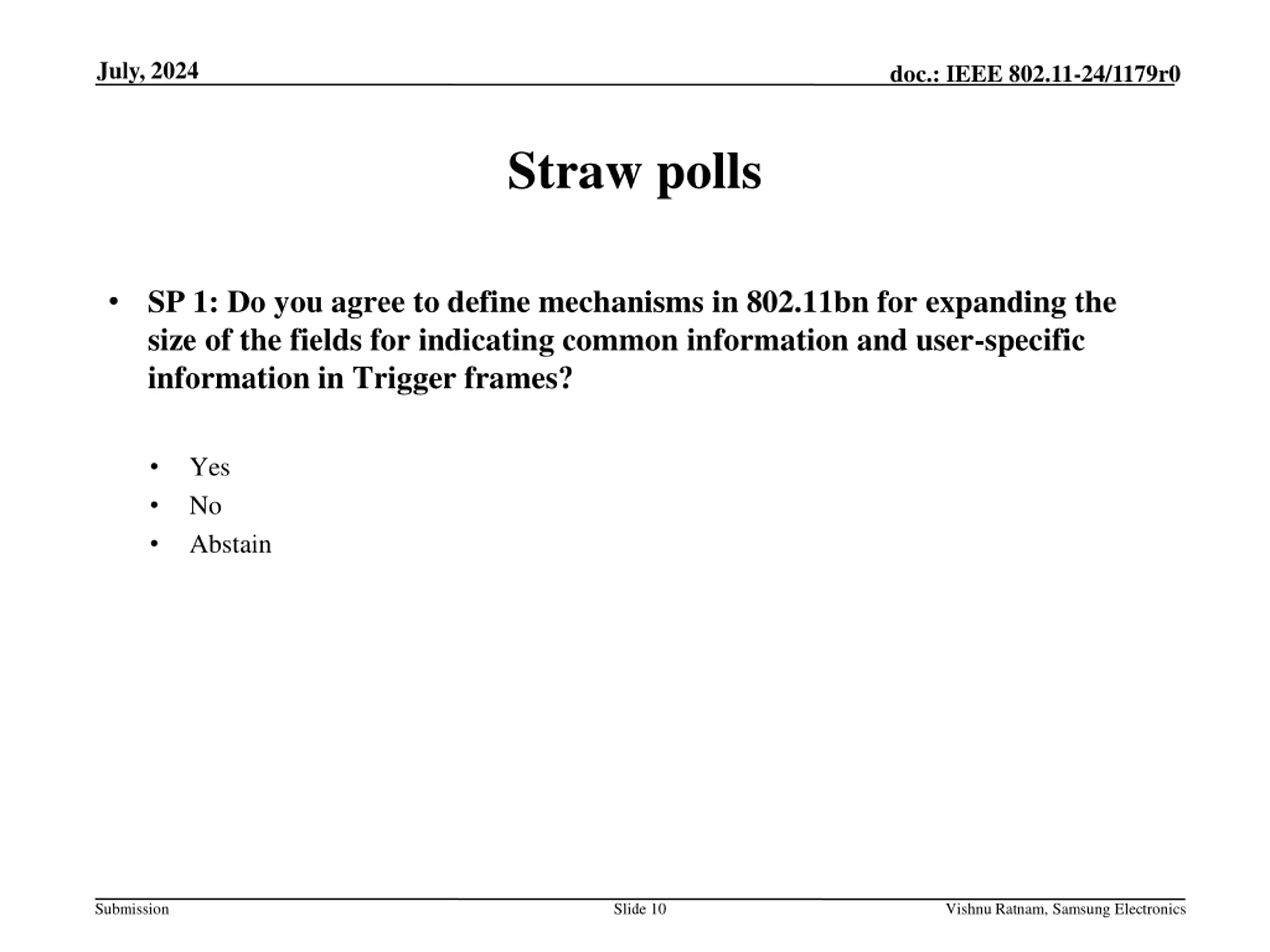 July, 2024 doc.: IEEE 802.11-24/1179r0 Straw polls SP 1: Do you agree to define mechanisms in 802.11bn for expanding the size of the fields for indicating common information and user-specific information in Trigger frames? Yes No Abstain Submission Slide 10 Vishnu Ratnam, Samsung Electronics