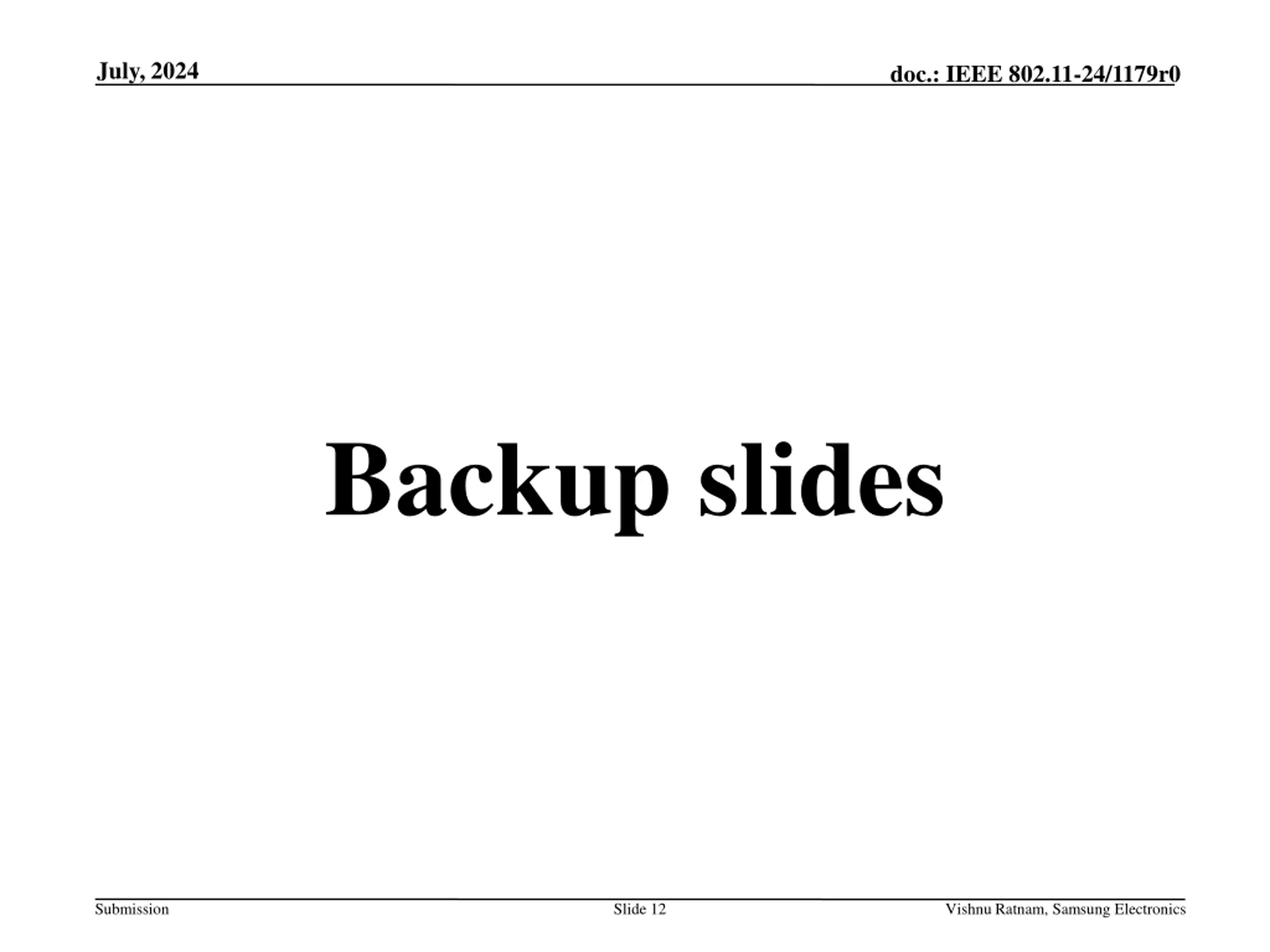 July, 2024 doc.: IEEE 802.11-24/1179r0 Backup slides Submission Slide 12 Vishnu Ratnam, Samsung Electronics