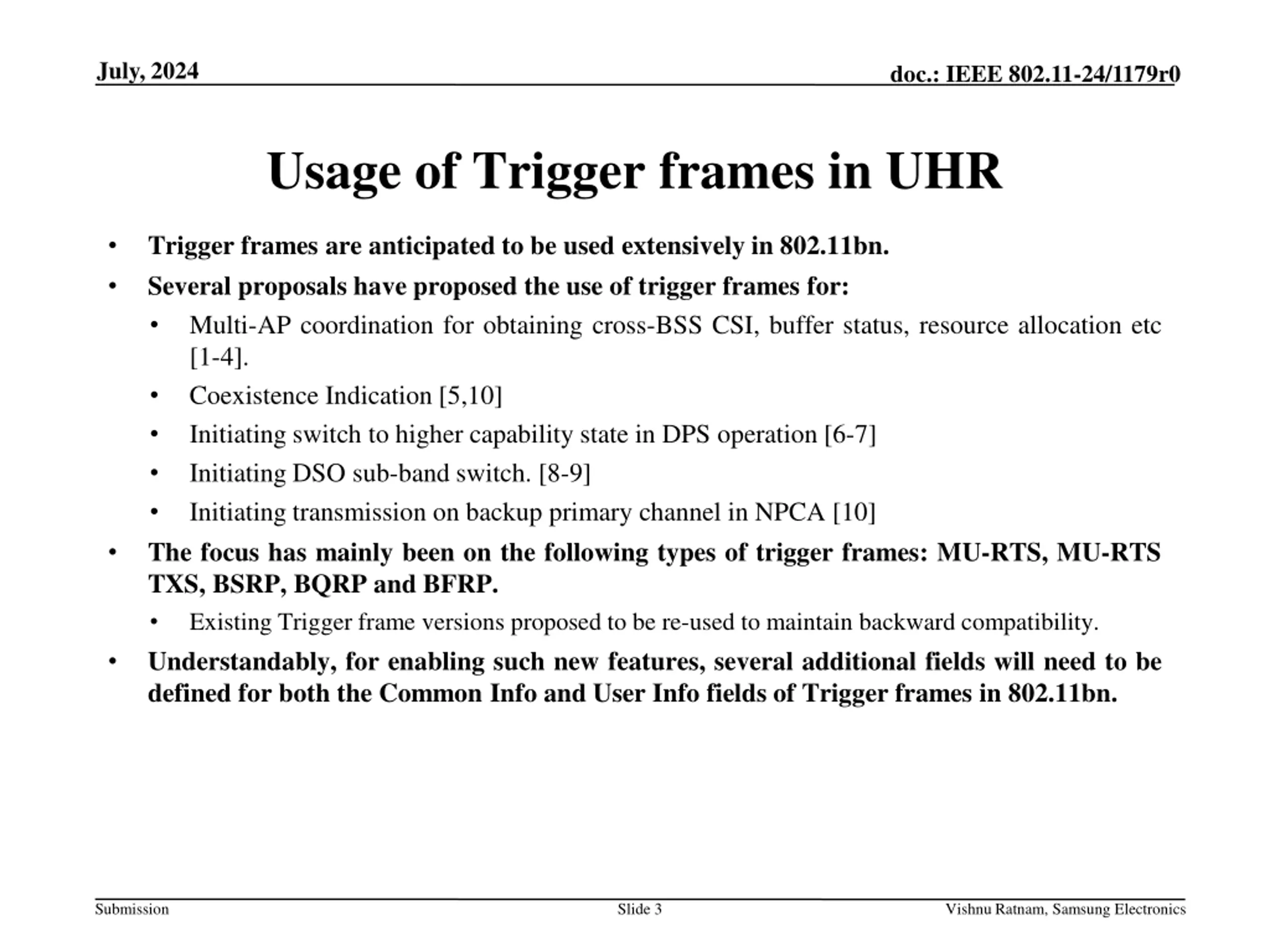 July, 2024 doc.: IEEE 802.11-24/1179r0 Usage of Trigger frames in UHR Trigger frames are anticipated to be used extensively in 802.11bn. Several proposals have proposed the use of trigger frames for: Multi-AP coordination for obtaining cross-BSS CSI, buffer status, resource allocation etc [1-4]. Coexistence Indication [5,10] Initiating switch to higher capability state in DPS operation [6-7] Initiating DSO sub-band switch. [8-9] Initiating transmission on backup primary channel in NPCA [10] The focus has mainly been on the following types of trigger frames: MU-RTS, MU-RTS TXS, BSRP, BQRP and BFRP. Existing Trigger frame versions proposed to be re-used to maintain backward compatibility. Understandably, for enabling such new features, several additional fields will need to be defined for both the Common Info and User Info fields of Trigger frames in 802.11bn. Submission Slide 3 Vishnu Ratnam, Samsung Electronics