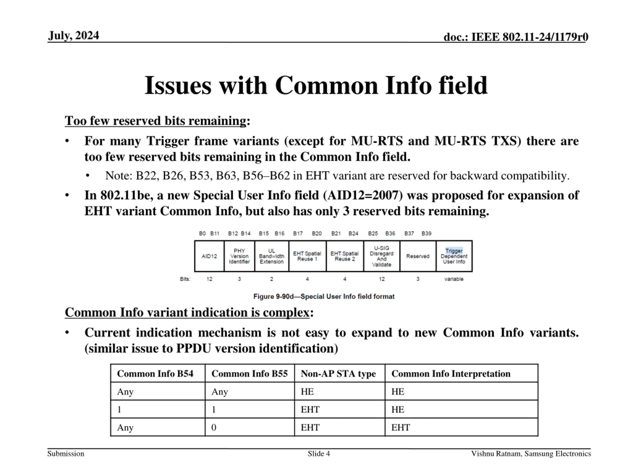 July, 2024 doc.: IEEE 802.11-24/1179r0 Issues with Common Info field Too few reserved bits remaining: For many Trigger frame variants (except for MU-RTS and MU-RTS TXS) there are too few reserved bits remaining in the Common Info field. Note: B22, B26, B53, B63, B56 B62 in EHT variant are reserved for backward compatibility. In 802.11be, a new Special User Info field (AID12=2007) was proposed for expansion of EHT variant Common Info, but also has only 3 reserved bits remaining. Common Info variant indication is complex: Current indication mechanism is not easy to expand to new Common Info variants. (similar issue to PPDU version identification) Common Info B54 Common Info B55 Non-AP STA type Common Info Interpretation Any Any HE HE 1 1 EHT HE Any 0 EHT EHT Submission Slide 4 Vishnu Ratnam, Samsung Electronics
