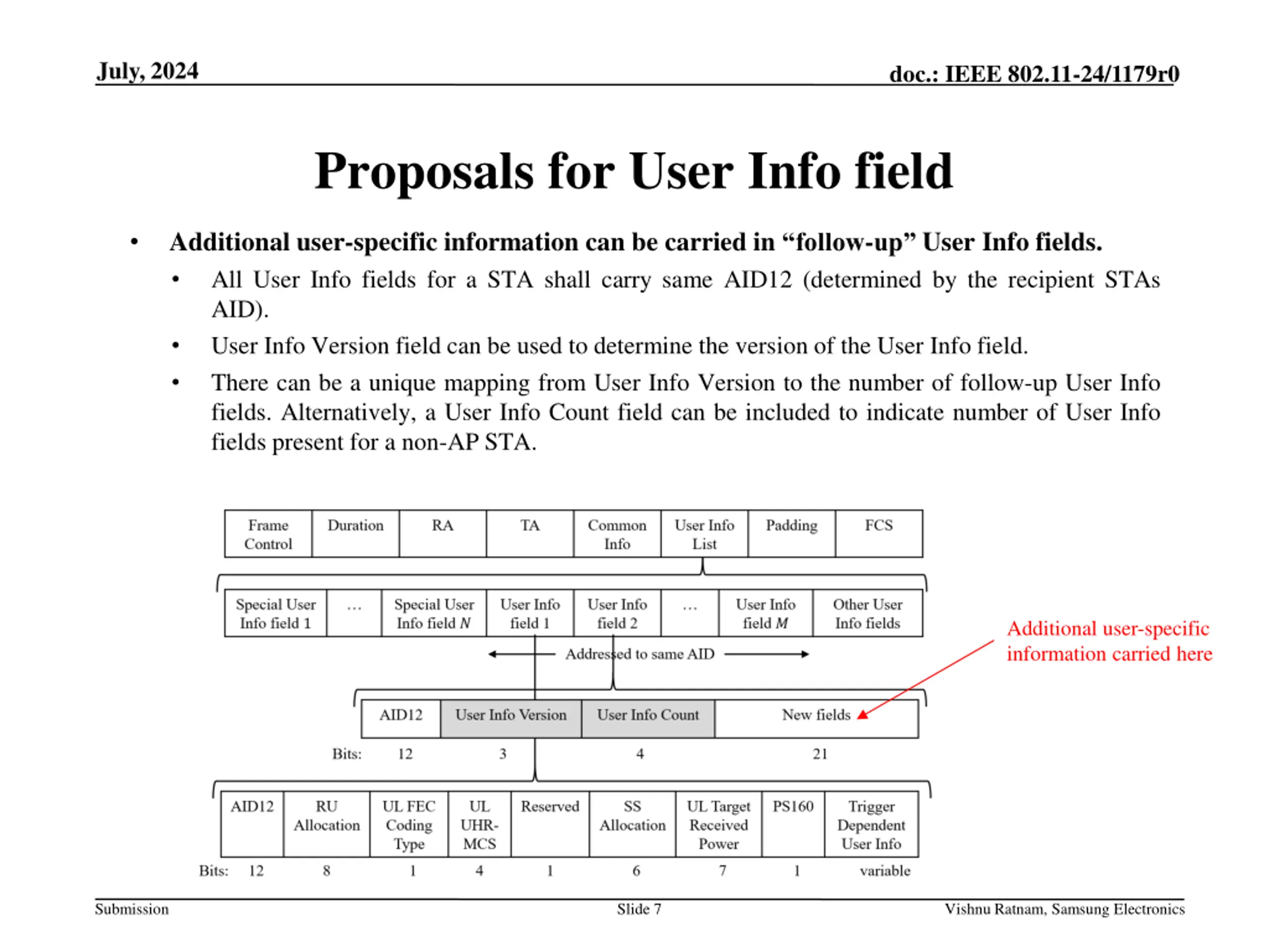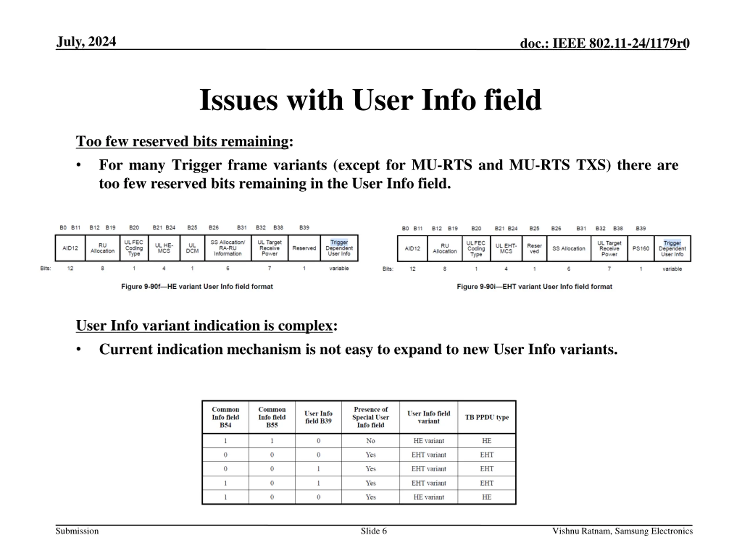 July, 2024 doc.: IEEE 802.11-24/1179r0 Issues with User Info field Too few reserved bits remaining: For many Trigger frame variants (except for MU-RTS and MU-RTS TXS) there are too few reserved bits remaining in the User Info field. User Info variant indication is complex: Current indication mechanism is not easy to expand to new User Info variants. Submission Slide 6 Vishnu Ratnam, Samsung Electronics
