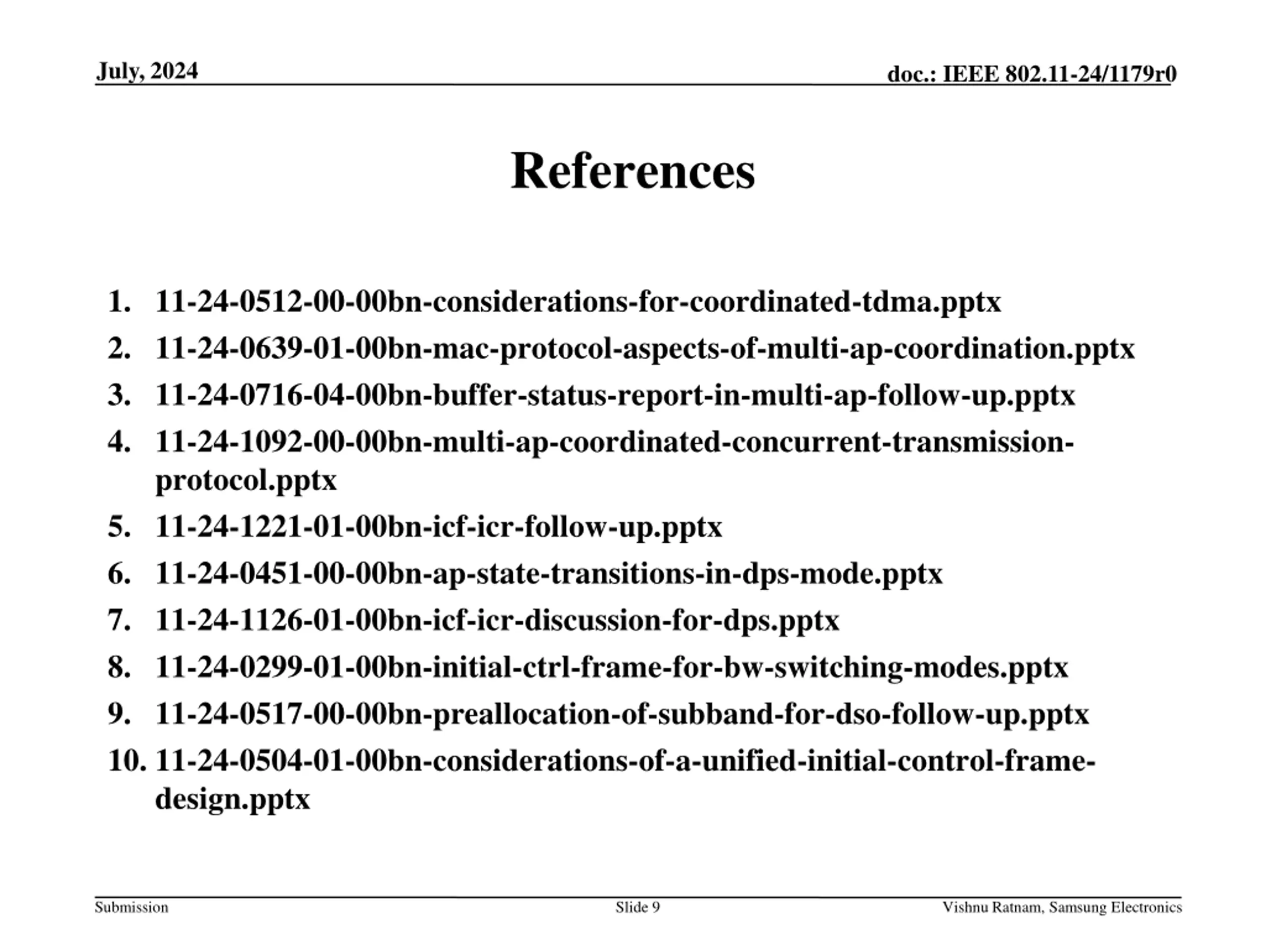 July, 2024 doc.: IEEE 802.11-24/1179r0 References 1. 11-24-0512-00-00bn-considerations-for-coordinated-tdma.pptx 2. 11-24-0639-01-00bn-mac-protocol-aspects-of-multi-ap-coordination.pptx 3. 11-24-0716-04-00bn-buffer-status-report-in-multi-ap-follow-up.pptx 4. 11-24-1092-00-00bn-multi-ap-coordinated-concurrent-transmission- protocol.pptx 5. 11-24-1221-01-00bn-icf-icr-follow-up.pptx 6. 11-24-0451-00-00bn-ap-state-transitions-in-dps-mode.pptx 7. 11-24-1126-01-00bn-icf-icr-discussion-for-dps.pptx 8. 11-24-0299-01-00bn-initial-ctrl-frame-for-bw-switching-modes.pptx 9. 11-24-0517-00-00bn-preallocation-of-subband-for-dso-follow-up.pptx 10. 11-24-0504-01-00bn-considerations-of-a-unified-initial-control-frame- design.pptx Submission Slide 9 Vishnu Ratnam, Samsung Electronics