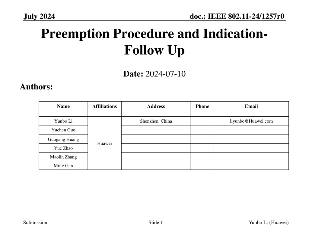 doc.: IEEE 802.11-24/1257r0 July 2024 Preemption Procedure and Indication- Follow Up Date: 2024-07-10 Authors: Name Affiliations Address Phone Email Yunbo Li Shenzhen, China liyunbo@Huawei.com Yuchen Guo Guogang Huang Huawei Yue Zhao Maolin Zhang Ming Gan Submission Slide 1 Yunbo Li (Huawei)