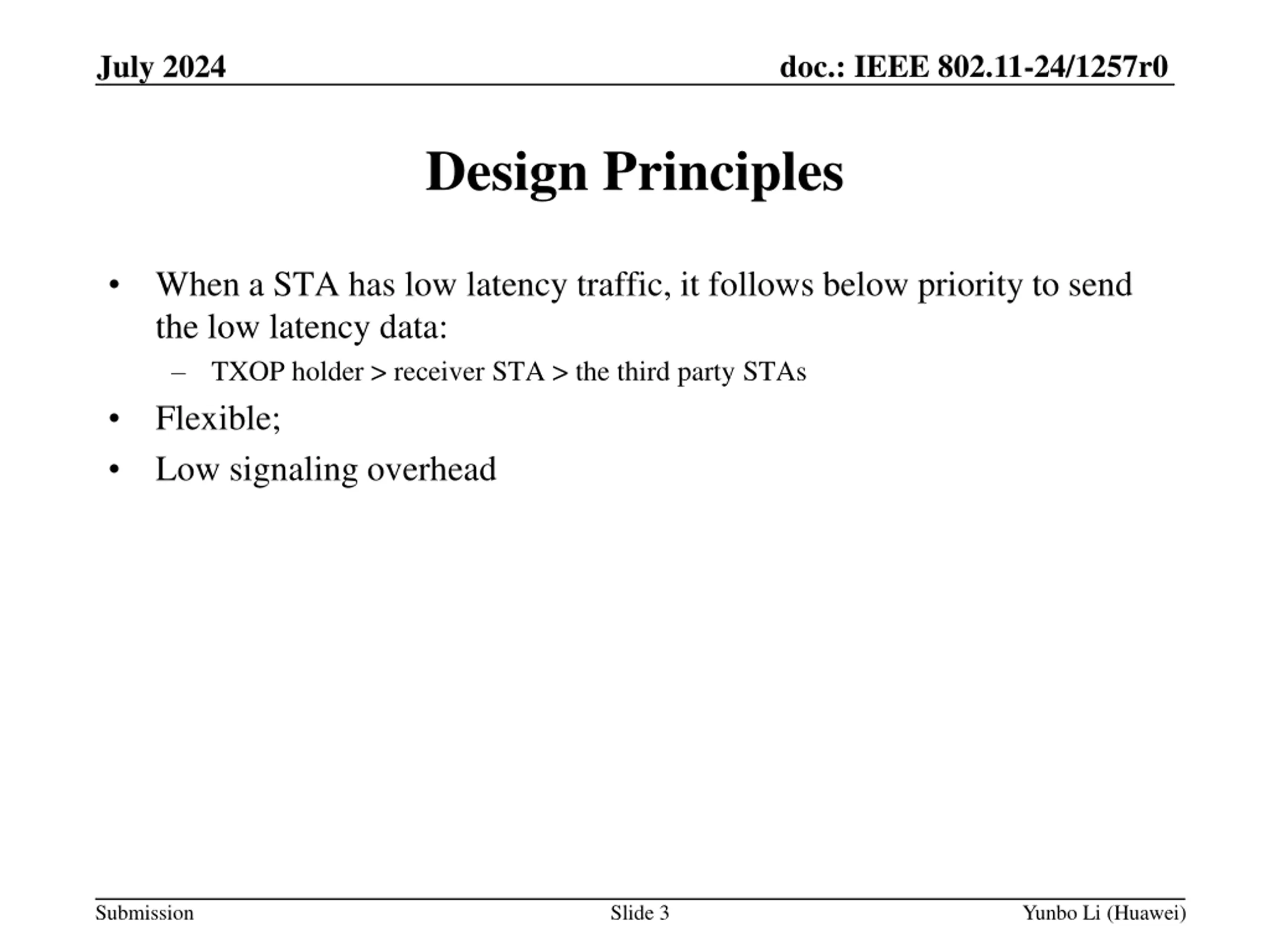doc.: IEEE 802.11-24/1257r0 July 2024 Design Principles When a STA has low latency traffic, it follows below priority to send the low latency data: TXOP holder > receiver STA > the third party STAs Flexible; Low signaling overhead Submission Slide 3 Yunbo Li (Huawei)
