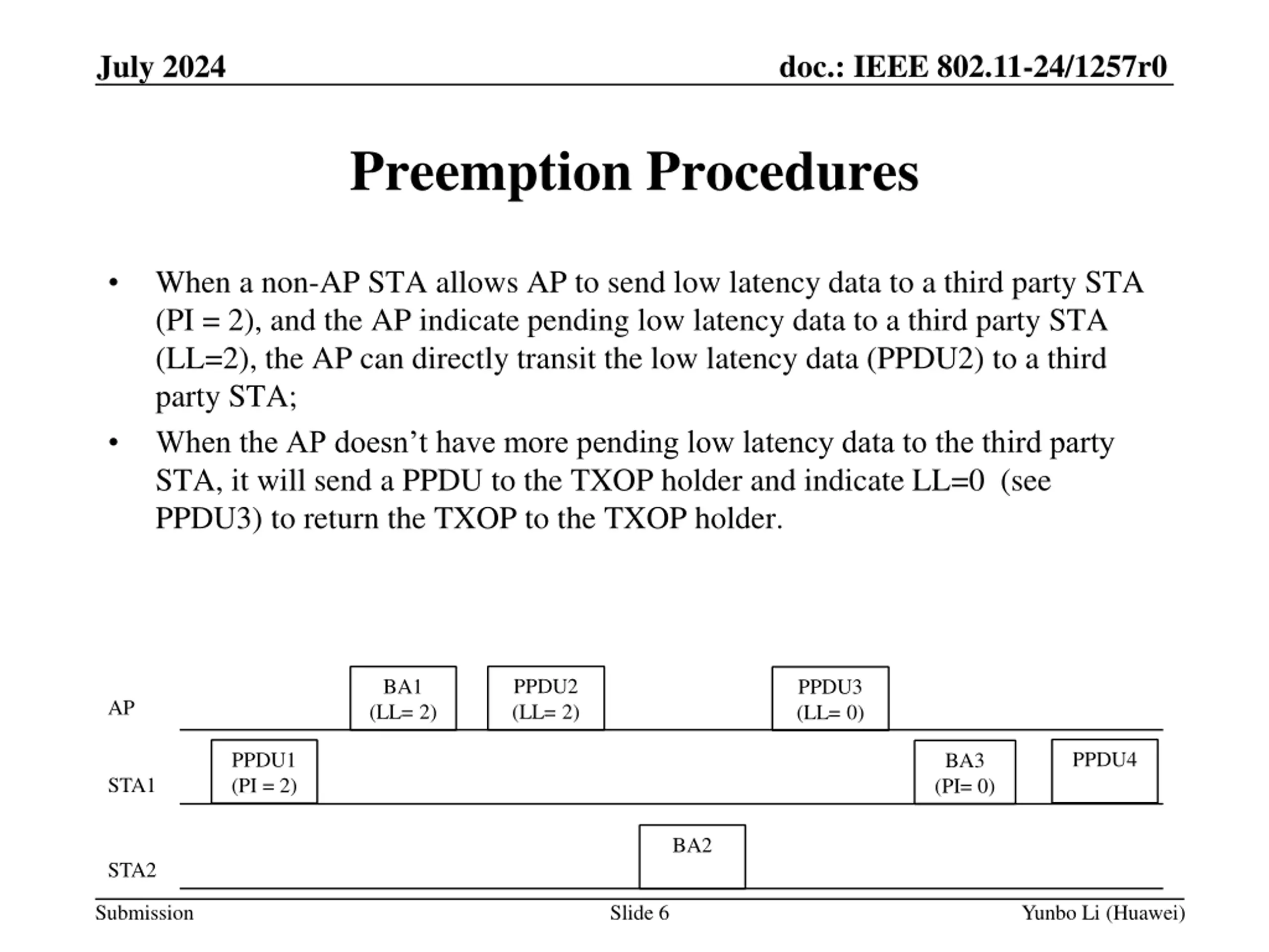 doc.: IEEE 802.11-24/1257r0 July 2024 Preemption Procedures When AP allows preemption at receiver STA side (PI = 1), and the receiver STA indicate pending low latency data to AP (LL=1), the receiver STA can directly transit the low latency data (PPDU2) to AP; When the receiver STA has more pending low latency data to AP, it will indicate LL=1 in the transmitting packet (see PPDU2), otherwise indicate LL=0 (see PPDU3); When AP receive a PPDU from the receiver STA with LL=0, the AP can indicate PI = 0 in the response frame (see BA3), and take back the TXOP; Same procedure can be used when a non-AP STA is the TXOP holder. PPDU4 BA2 (PI= 1) PPDU1 (PI = 1) BA3 (PI= 0) AP PPDU2 (LL= 1) BA1 (LL= 1) PPDU3 (LL= 0) STA1 Submission Slide 5 Yunbo Li (Huawei)
