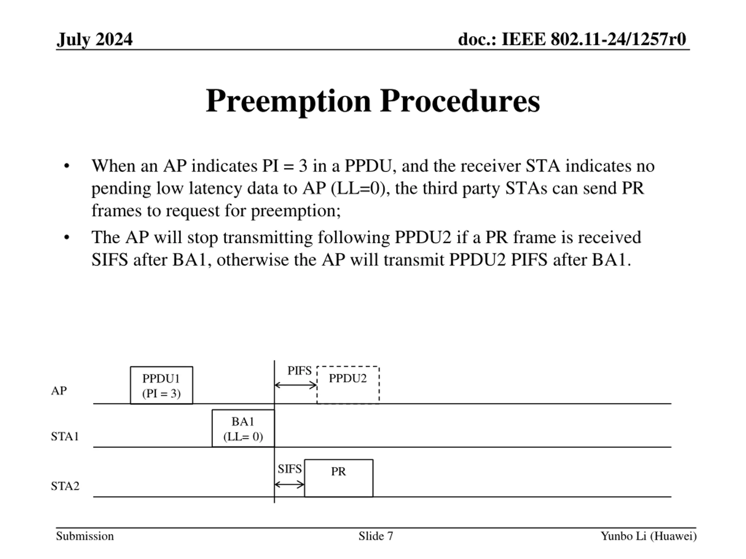 doc.: IEEE 802.11-24/1257r0 July 2024 Preemption Procedures When a non-AP STA allows AP to send low latency data to a third party STA (PI = 2), and the AP indicate pending low latency data to a third party STA (LL=2), the AP can directly transit the low latency data (PPDU2) to a third party STA; When the AP doesn t have more pending low latency data to the third party STA, it will send a PPDU to the TXOP holder and indicate LL=0 (see PPDU3) to return the TXOP to the TXOP holder. PPDU2 (LL= 2) BA1 (LL= 2) PPDU3 (LL= 0) AP PPDU4 PPDU1 (PI = 2) BA3 (PI= 0) STA1 BA2 STA2 Submission Slide 6 Yunbo Li (Huawei)