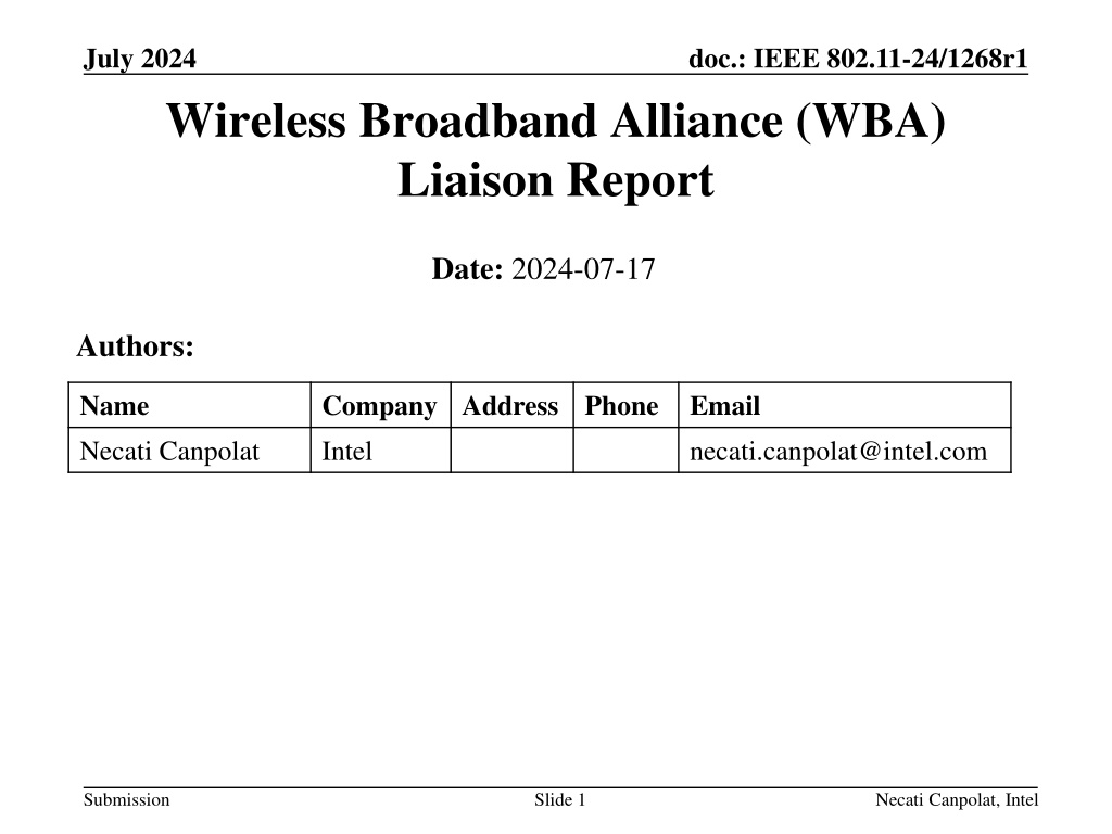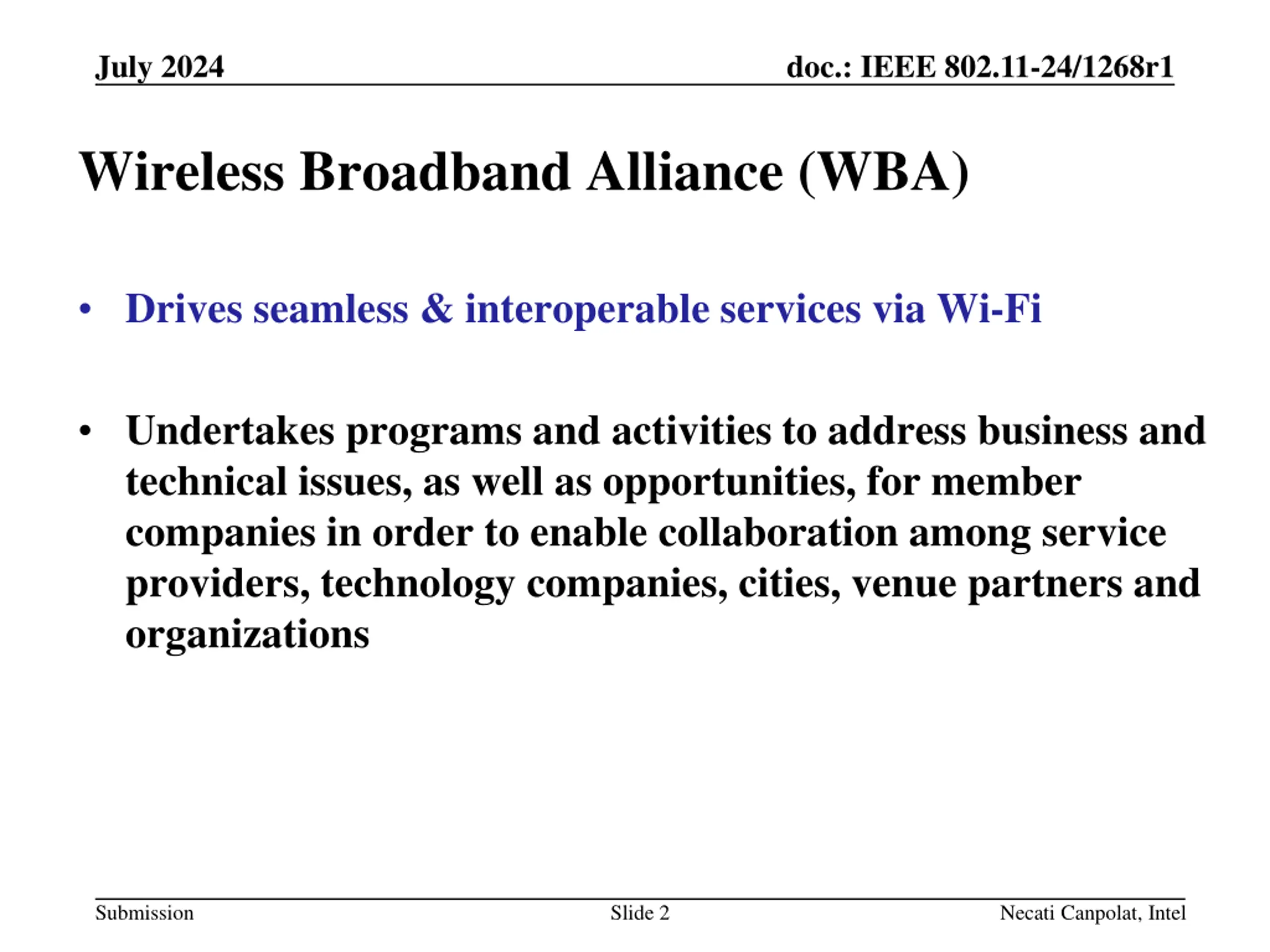 July 2024 doc.: IEEE 802.11-24/1268r1 Wireless Broadband Alliance (WBA) Liaison Report Date: 2024-07-17 Authors: Name Necati Canpolat Company Address Intel Phone Email necati.canpolat@intel.com Submission Slide 1 Necati Canpolat, Intel