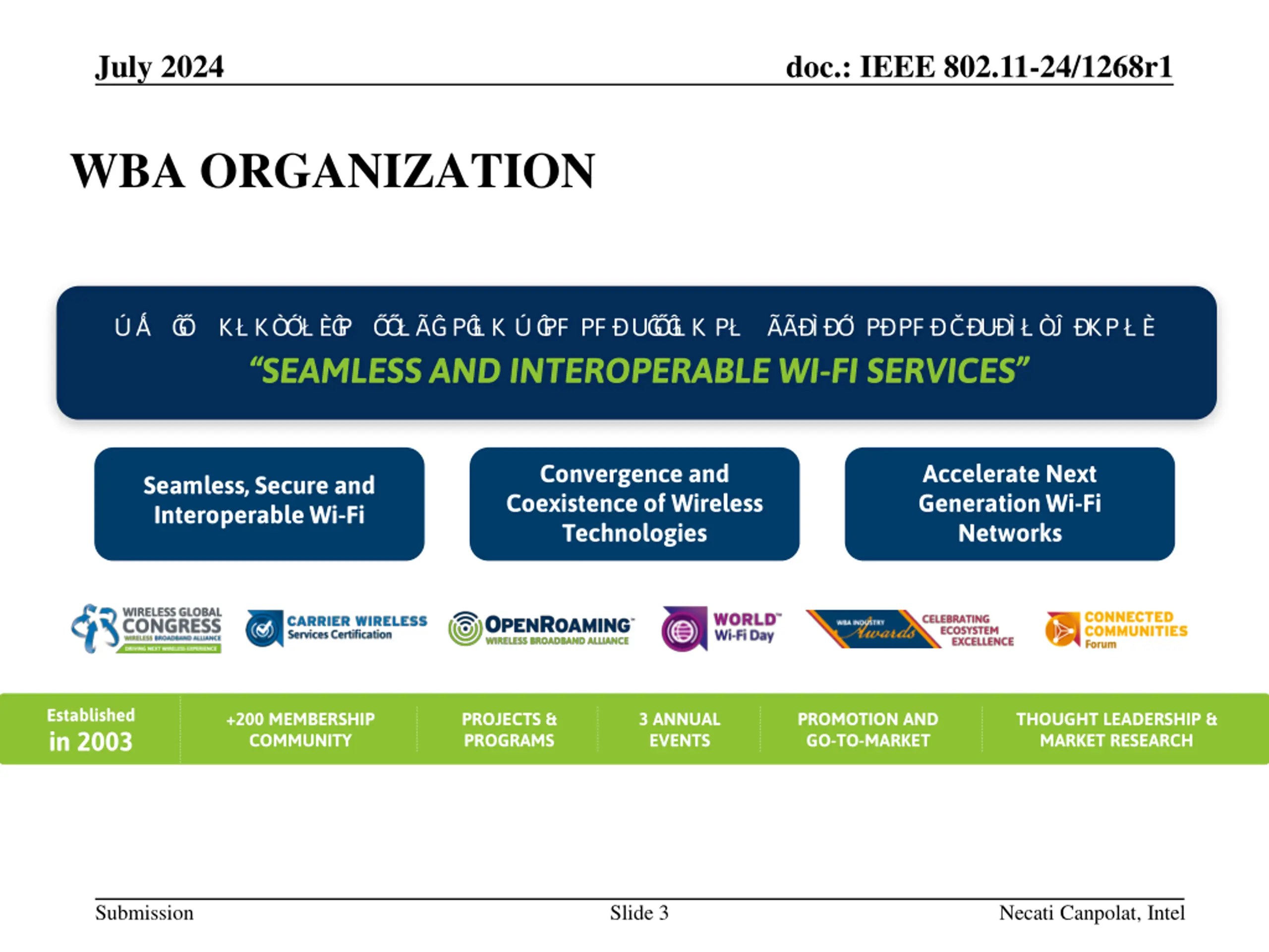 July 2024 doc.: IEEE 802.11-24/1268r1 Wireless Broadband Alliance (WBA) Drives seamless & interoperable services via Wi-Fi Undertakes programs and activities to address business and technical issues, as well as opportunities, for member companies in order to enable collaboration among service providers, technology companies, cities, venue partners and organizations Submission Slide 2 Necati Canpolat, Intel