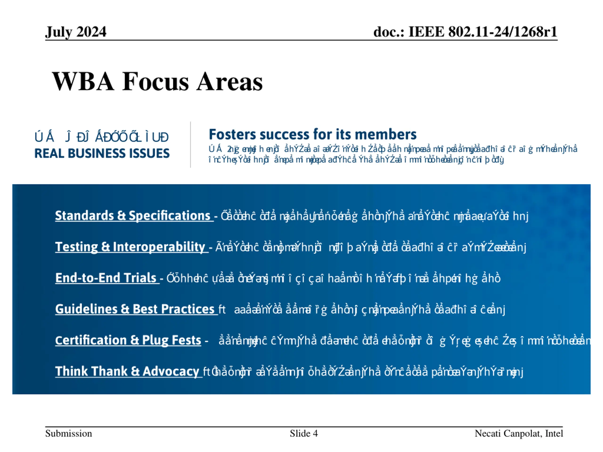 July 2024 doc.: IEEE 802.11-24/1268r1 WBA Focus Areas Fosters success for its members WBA M EM BERS S O L VE REAL BUSINESS ISSUES WBA s m i s s i o n i s t o enabl e co l l abo rat i o n bet ween s ervi ce p ro vi ders , t echno l o gy co m p ani es and o rgani zat i o ns t o dri ve p o s i t i ve change and enabl e o p p o rt uni t i es fo r gro wt h. Standards & Specifications - S et t i ng t he s cene, requi rem ent s and creat i ng s p eci ficat i o ns Testing & Interoperability - Creat i ng t es t p l ans t o s ho wcas e t he t echno l o gy cap abi l i t i es End-to-End Trials - Runni ng fiel d t ri al s / p ro o f o f co ncep t o n real - wo rl d envi ro nm ent Guidelines & Best Practices A ccel erat e dep l o ym ent s o f s ervi ces and t echno l o gi es Certification & Plug Fests - A ddres s i ng gap s and hel p i ng t he i ndus t ry t o m axi m i zi ng bi z o p p o rt uni t i es Think Thank & Advocacy I ndus t ry l eaders ro undt abl es and t arget ed vert i cal s anal ys i s Submission Slide 4 Necati Canpolat, Intel