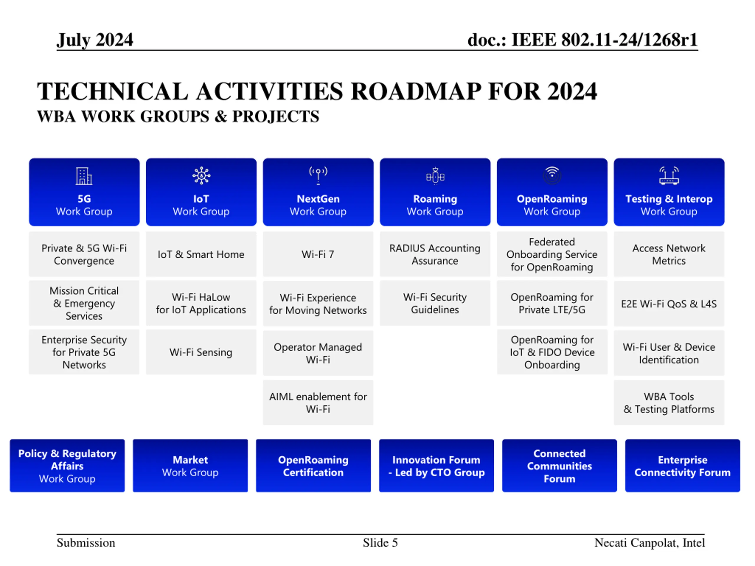 July 2024 doc.: IEEE 802.11-24/1268r1 TECHNICAL ACTIVITIES ROADMAP FOR 2024 WBA WORK GROUPS & PROJECTS 5G IoT NextGen Work Group Roaming Work Group OpenRoaming Work Group Testing & Interop Work Group Work Group Work Group Federated Onboarding Service for OpenRoaming Private & 5G Wi-Fi Convergence RADIUS Accounting Assurance Access Network Metrics IoT & Smart Home Wi-Fi 7 Mission Critical & Emergency Services Wi-Fi HaLow for IoT Applications Wi-Fi Security Guidelines OpenRoaming for Private LTE/5G Wi-Fi Experience for Moving Networks E2E Wi-Fi QoS & L4S Enterprise Security for Private 5G Networks OpenRoaming for IoT & FIDO Device Onboarding Operator Managed Wi-Fi Wi-Fi User & Device Identification Wi-Fi Sensing AIML enablement for Wi-Fi WBA Tools & Testing Platforms Policy & Regulatory Affairs Work Group Connected Communities Forum Market Work Group OpenRoaming Certification Innovation Forum - Led by CTO Group Enterprise Connectivity Forum Submission Slide 5 Necati Canpolat, Intel