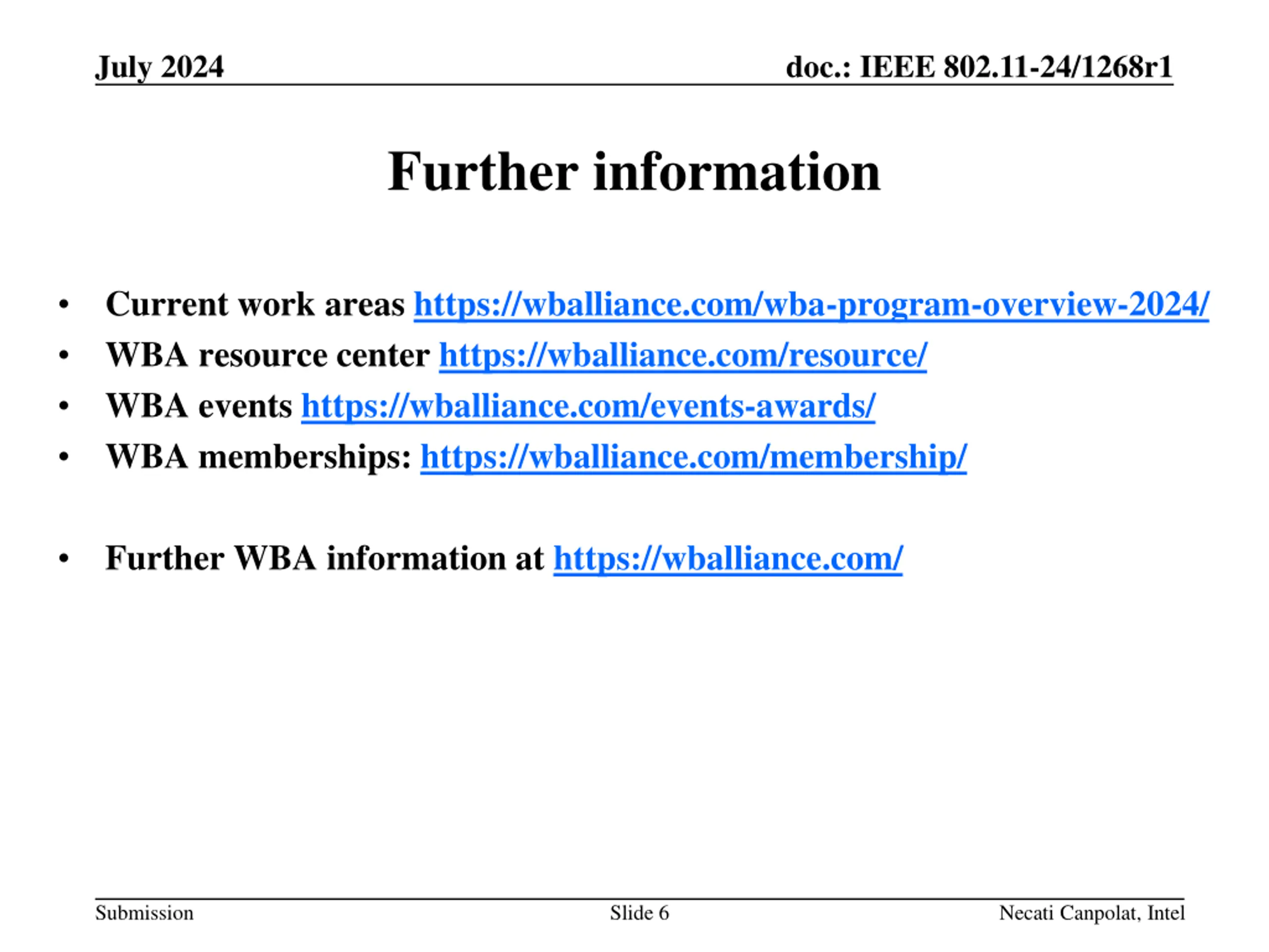 July 2024 doc.: IEEE 802.11-24/1268r1 Further information Current work areas https://wballiance.com/wba-program-overview-2024/ WBA resource center https://wballiance.com/resource/ WBA events https://wballiance.com/events-awards/ WBA memberships: https://wballiance.com/membership/ Further WBA information at https://wballiance.com/ Submission Slide 6 Necati Canpolat, Intel