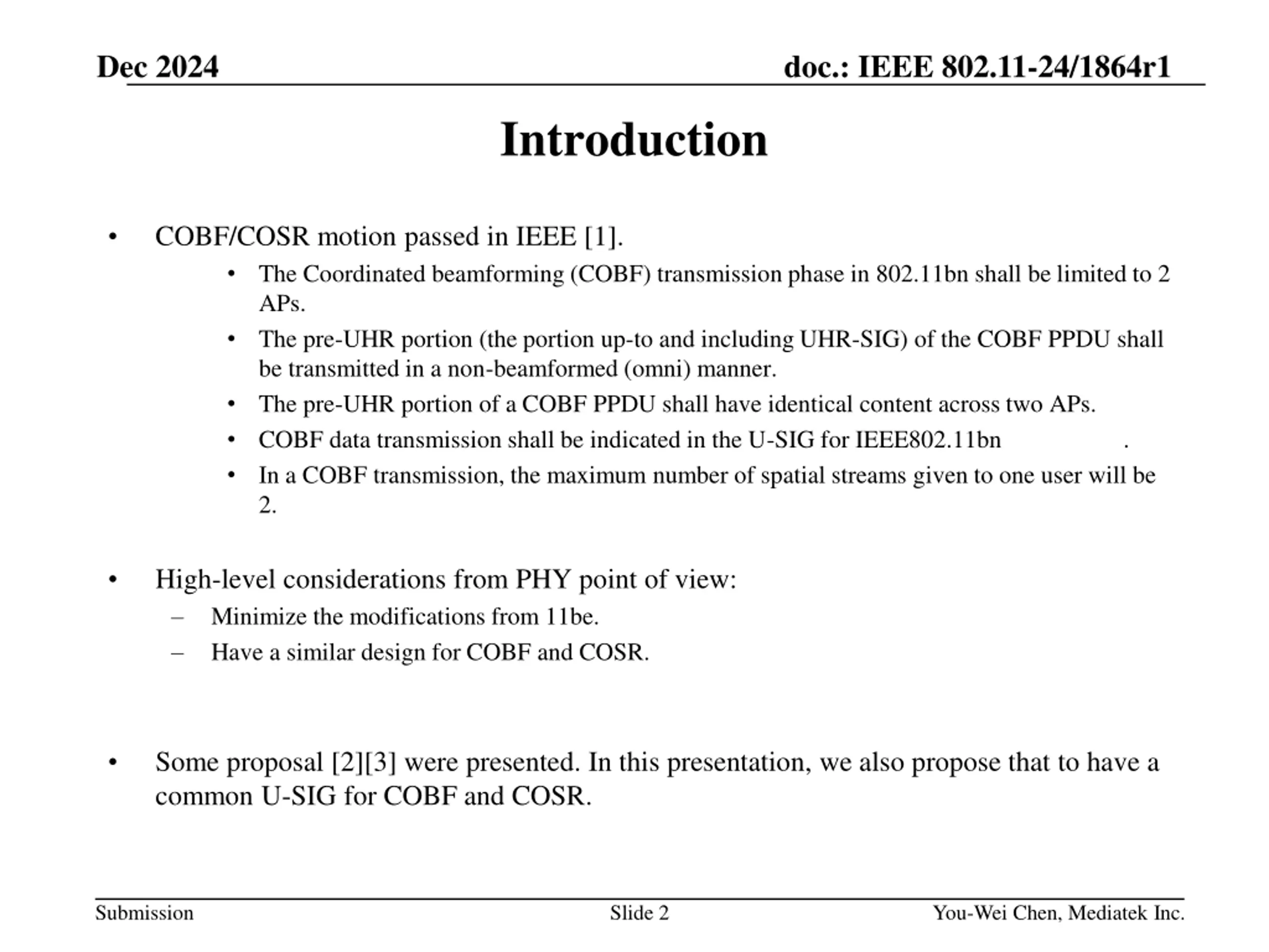 Dec 2024 doc.: IEEE 802.11-24/1864r1 Introduction COBF/COSR motion passed in IEEE [1]. The Coordinated beamforming (COBF) transmission phase in 802.11bn shall be limited to 2 APs. The pre-UHR portion (the portion up-to and including UHR-SIG) of the COBF PPDU shall be transmitted in a non-beamformed (omni) manner. The pre-UHR portion of a COBF PPDU shall have identical content across two APs. COBF data transmission shall be indicated in the U-SIG for IEEE802.11bn In a COBF transmission, the maximum number of spatial streams given to one user will be 2. . High-level considerations from PHY point of view: Minimize the modifications from 11be. Have a similar design for COBF and COSR. Some proposal [2][3] were presented. In this presentation, we also propose that to have a common U-SIG for COBF and COSR. Submission Slide 2 You-Wei Chen, Mediatek Inc.