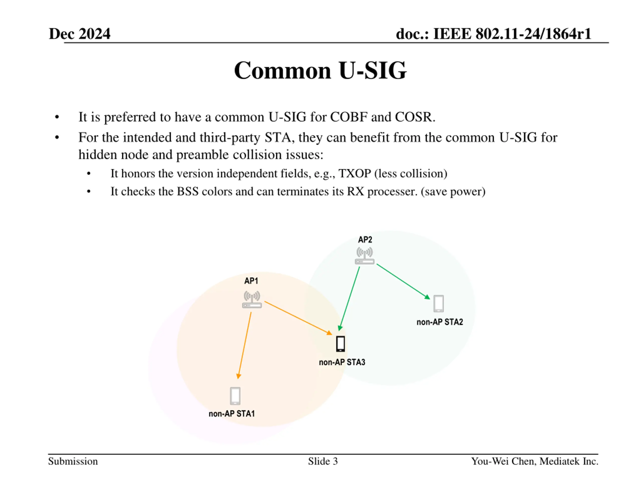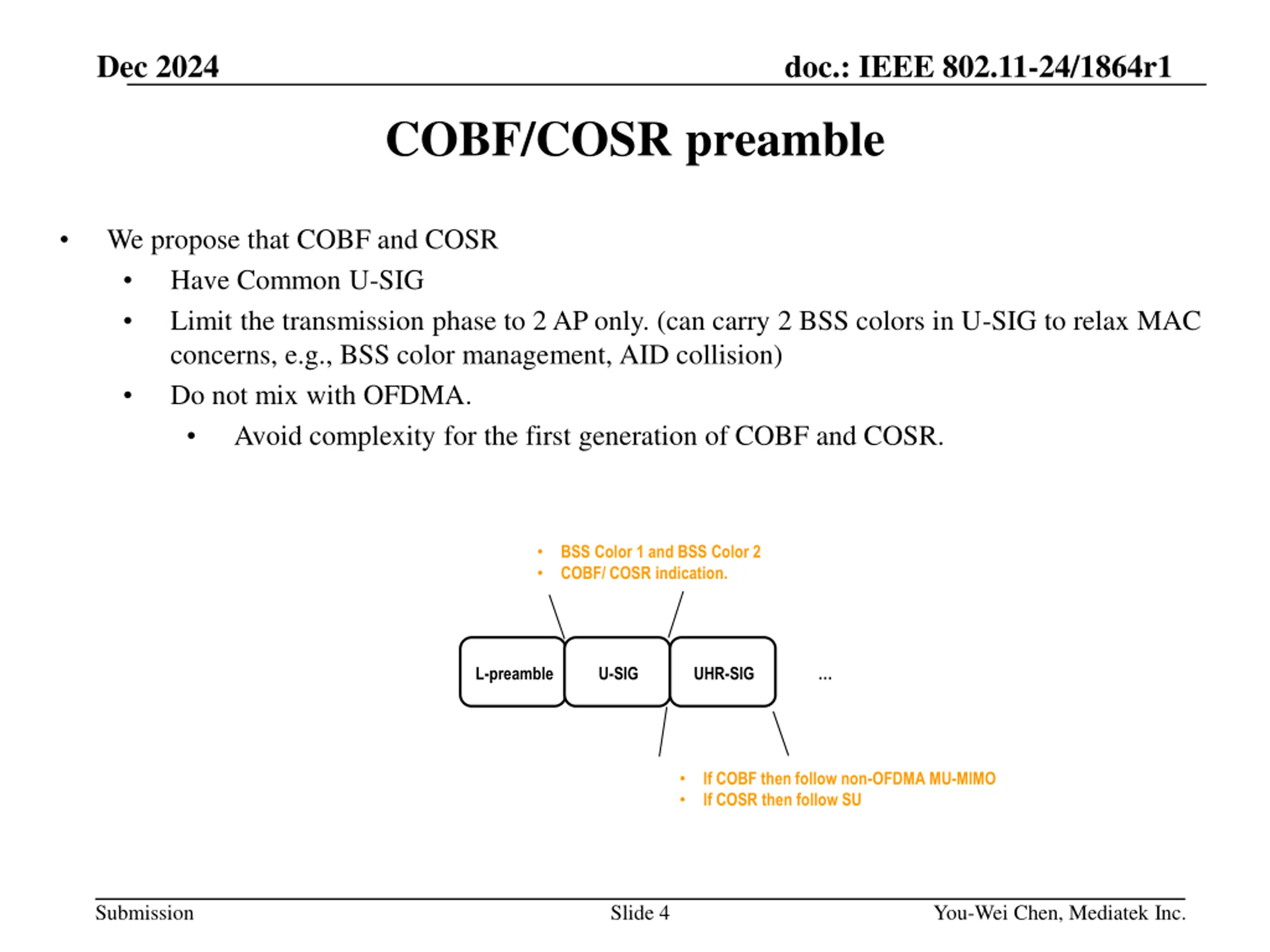 Dec 2024 doc.: IEEE 802.11-24/1864r1 COBF/COSR PPDU Consideration and U-SIG Signaling Date: 2024-12-09 Authors: Name Affiliations Address Phone Email You-Wei Chen You-Wei.Chen@mediatek.com Jianhan Liu 2840 Junction Ave. San Jose, CA, 95134 Shengquan Hu Mediatek Julia Feng Thomas Pare Submission Slide 1 You-Wei Chen, Mediatek Inc.
