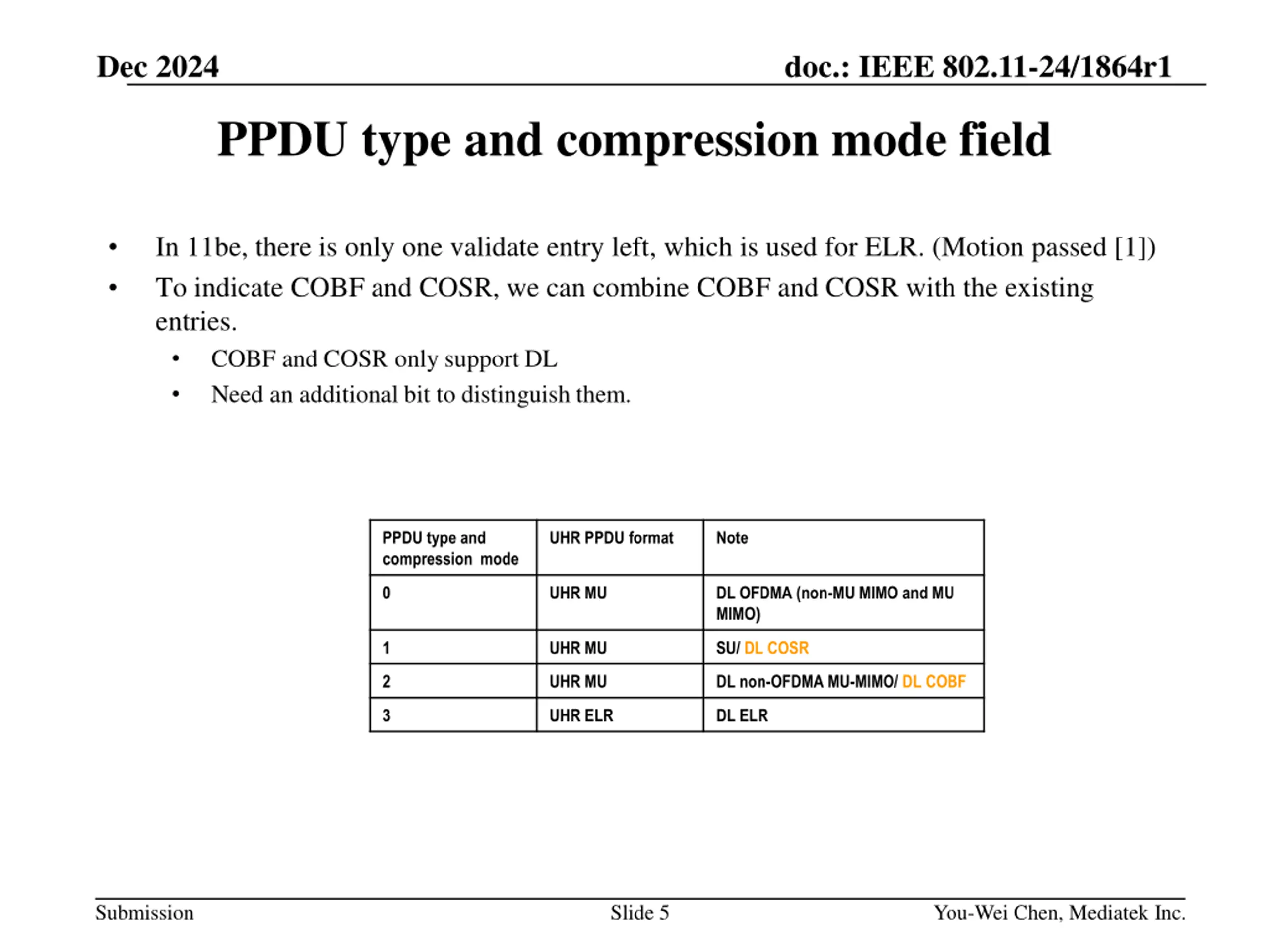 Dec 2024 doc.: IEEE 802.11-24/1864r1 PPDU type and compression mode field In 11be, there is only one validate entry left, which is used for ELR. (Motion passed [1]) To indicate COBF and COSR, we can combine COBF and COSR with the existing entries. COBF and COSR only support DL Need an additional bit to distinguish them. PPDU type and compression mode UHR PPDU format Note 0 UHR MU DL OFDMA (non-MU MIMO and MU MIMO) 1 UHR MU SU/ DL COSR 2 UHR MU DL non-OFDMA MU-MIMO/ DL COBF 3 UHR ELR DL ELR Submission Slide 5 You-Wei Chen, Mediatek Inc.