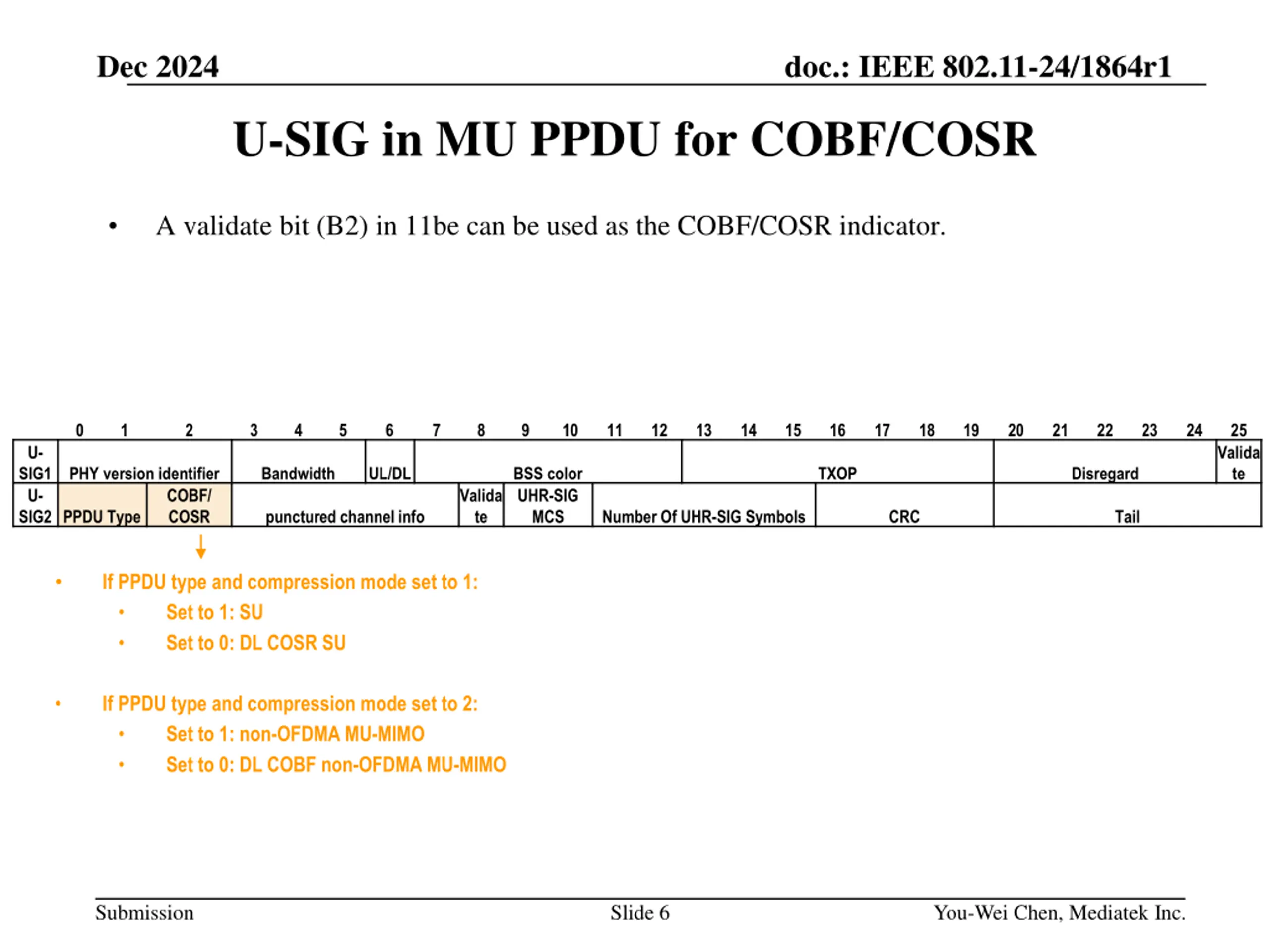 Dec 2024 doc.: IEEE 802.11-24/1864r1 U-SIG in MU PPDU for COBF/COSR A validate bit (B2) in 11be can be used as the COBF/COSR indicator. 0 1 2 3 4 5 6 7 8 9 10 11 12 13 14 15 16 17 18 19 20 21 22 23 24 25 U- Valida te SIG1 U- SIG2 PPDU Type PHY version identifier Bandwidth UL/DL BSS color UHR-SIG MCS TXOP Disregard COBF/ COSR Valida te punctured channel info Number Of UHR-SIG Symbols CRC Tail If PPDU type and compression mode set to 1: Set to 1: SU Set to 0: DL COSR SU If PPDU type and compression mode set to 2: Set to 1: non-OFDMA MU-MIMO Set to 0: DL COBF non-OFDMA MU-MIMO Submission Slide 6 You-Wei Chen, Mediatek Inc.