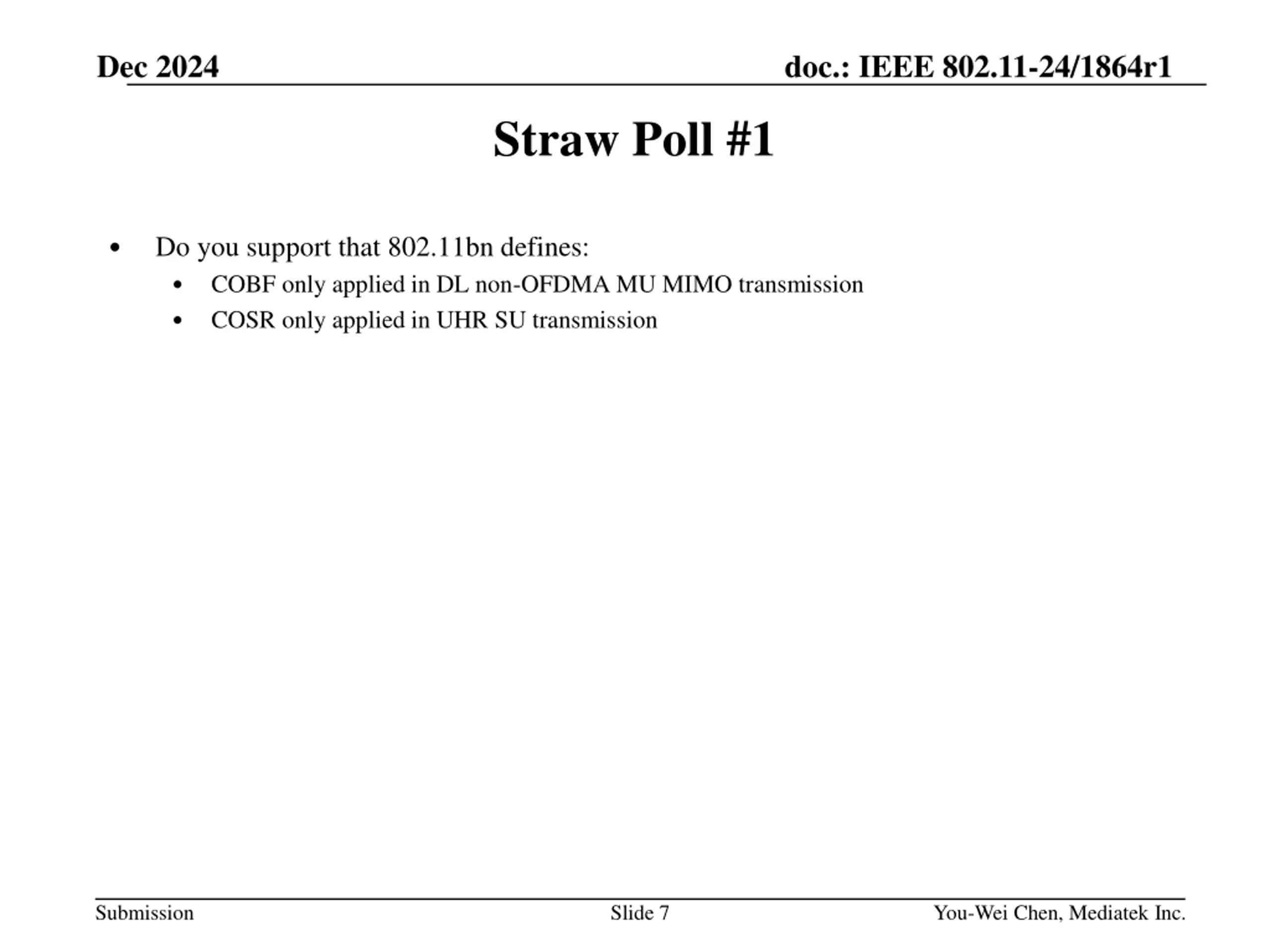 Dec 2024 doc.: IEEE 802.11-24/1864r1 Straw Poll #1 Do you support that 802.11bn defines: COBF only applied in DL non-OFDMA MU MIMO transmission COSR only applied in UHR SU transmission Submission Slide 7 You-Wei Chen, Mediatek Inc.