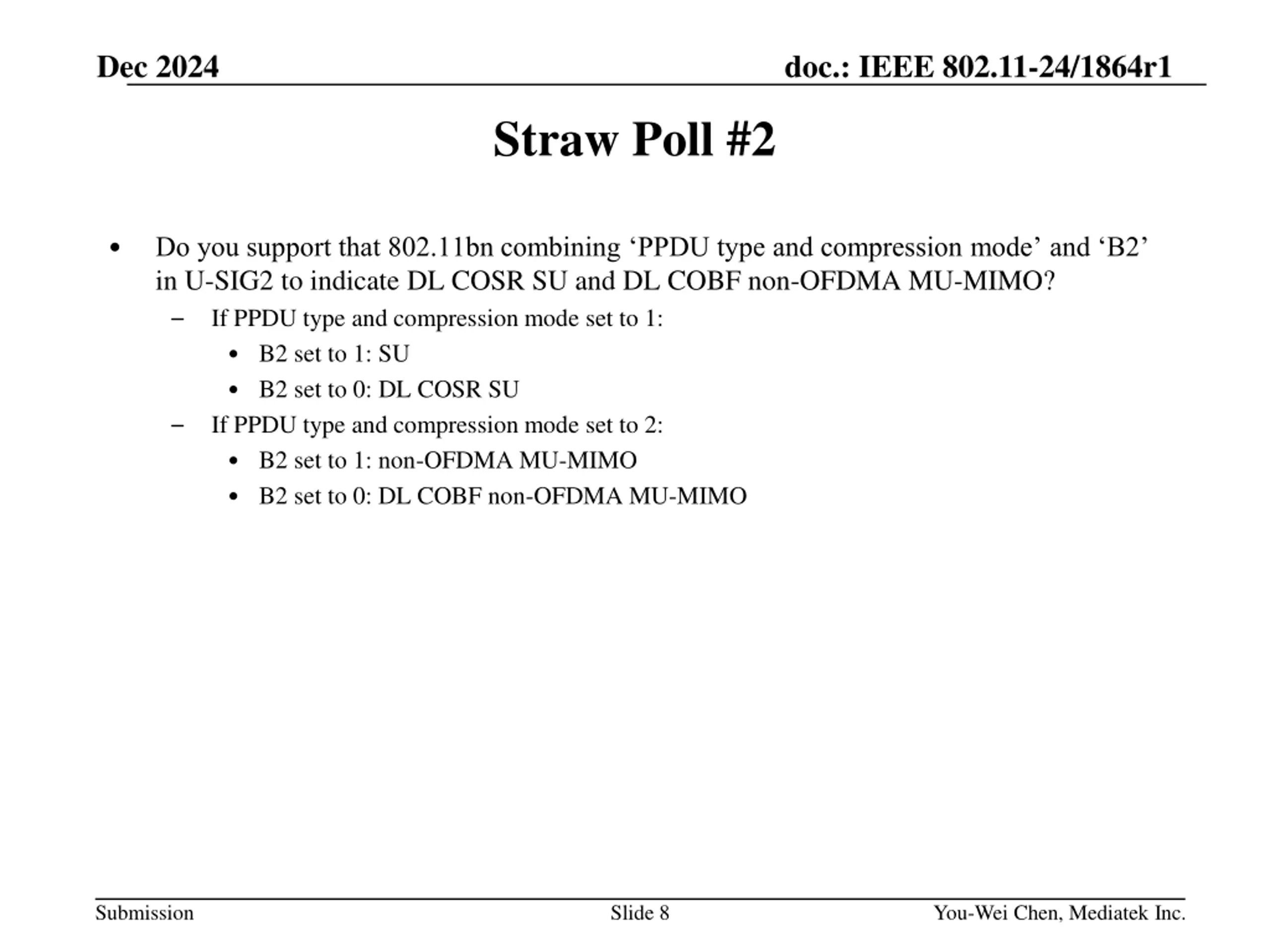 Dec 2024 doc.: IEEE 802.11-24/1864r1 Straw Poll #2 Do you support that 802.11bn combining PPDU type and compression mode and B2 in U-SIG2 to indicate DL COSR SU and DL COBF non-OFDMA MU-MIMO? If PPDU type and compression mode set to 1: B2 set to 1: SU B2 set to 0: DL COSR SU If PPDU type and compression mode set to 2: B2 set to 1: non-OFDMA MU-MIMO B2 set to 0: DL COBF non-OFDMA MU-MIMO Submission Slide 8 You-Wei Chen, Mediatek Inc.