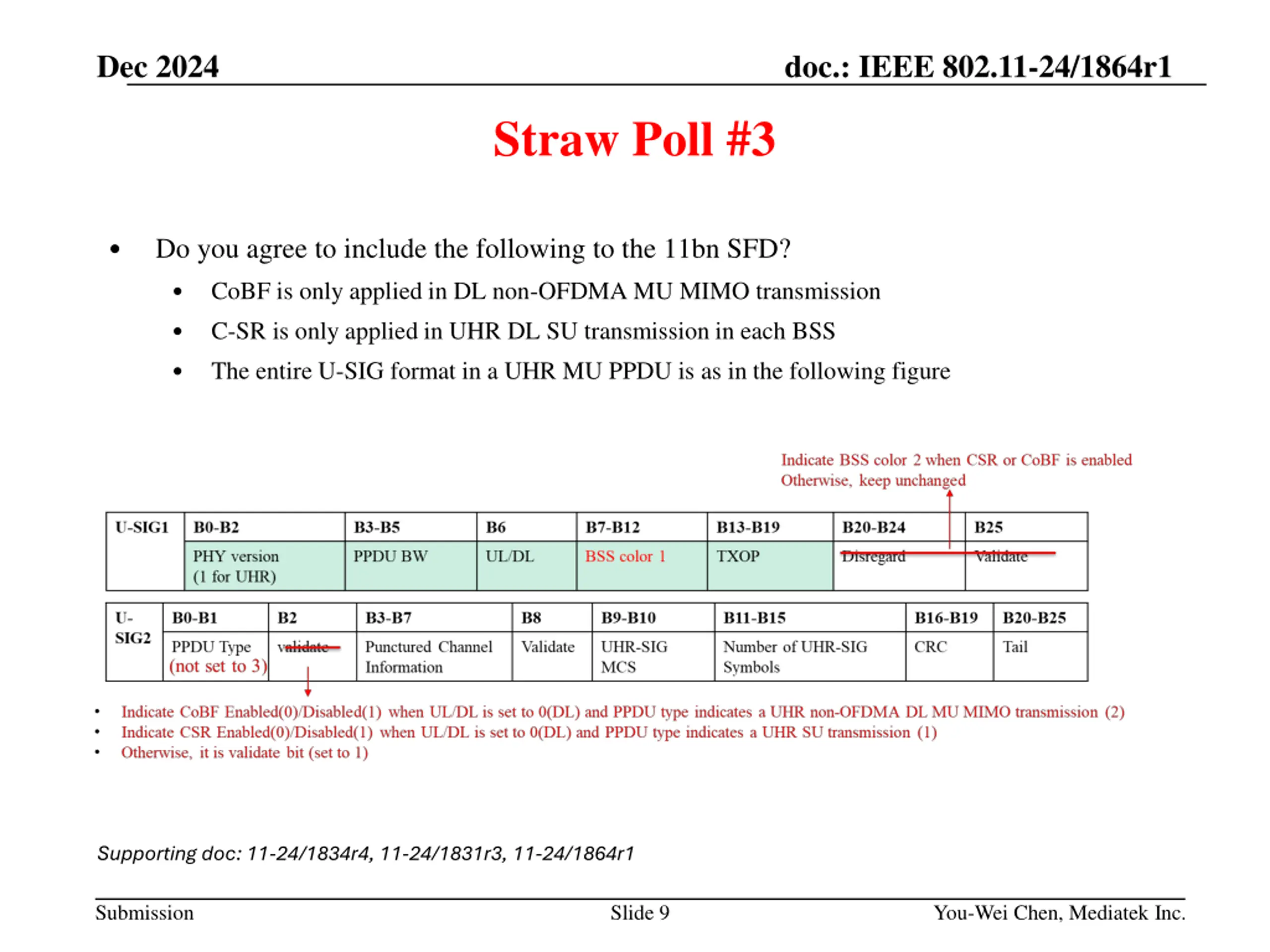 Dec 2024 doc.: IEEE 802.11-24/1864r1 Straw Poll #3 Do you agree to include the following to the 11bn SFD? CoBF is only applied in DL non-OFDMA MU MIMO transmission C-SR is only applied in UHR DL SU transmission in each BSS The entire U-SIG format in a UHR MU PPDU is as in the following figure Supporting doc: 11-24/1834r4, 11-24/1831r3, 11-24/1864r1 Submission Slide 9 You-Wei Chen, Mediatek Inc.