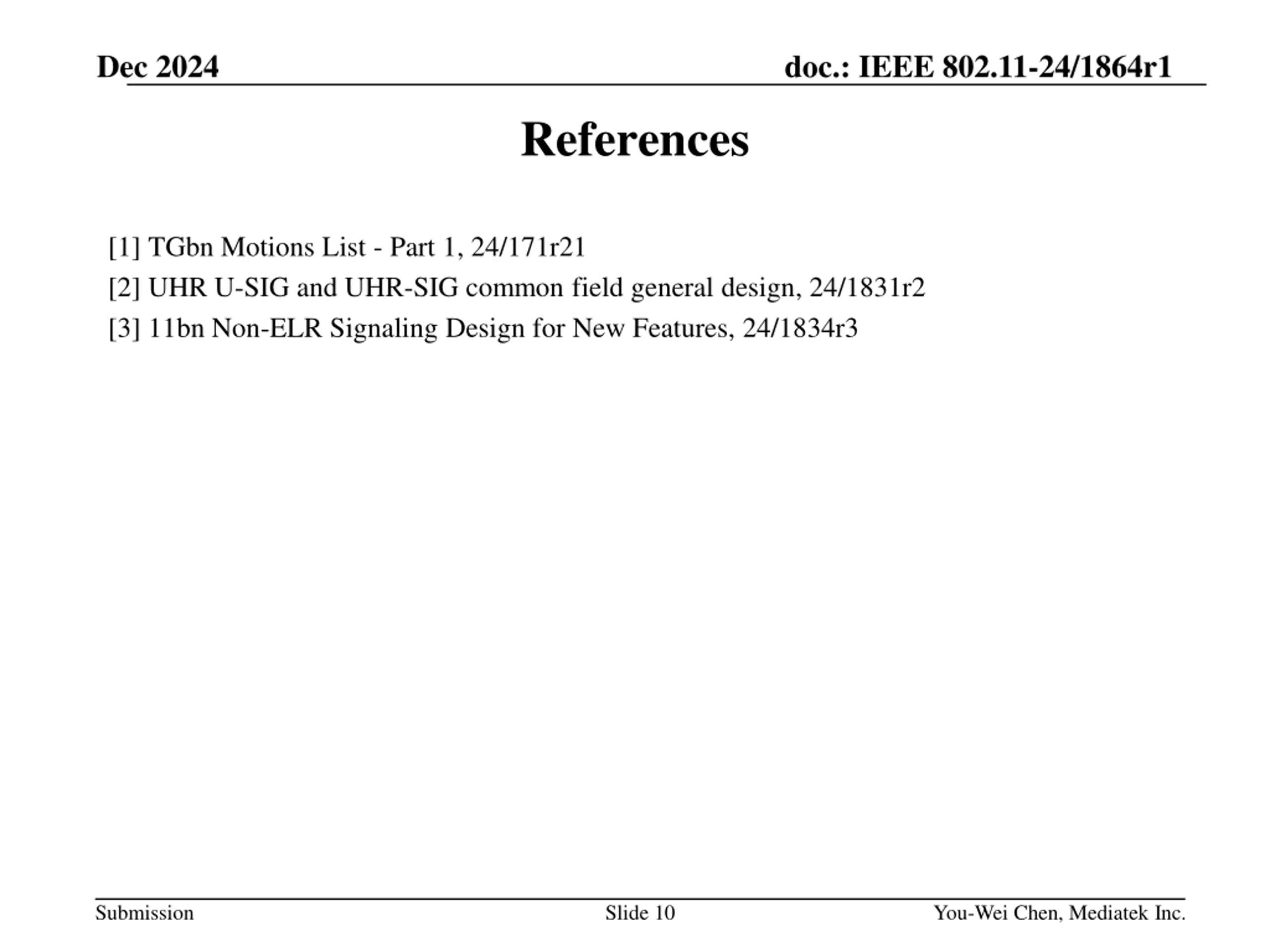 Dec 2024 doc.: IEEE 802.11-24/1864r1 References [1] TGbn Motions List - Part 1, 24/171r21 [2] UHR U-SIG and UHR-SIG common field general design, 24/1831r2 [3] 11bn Non-ELR Signaling Design for New Features, 24/1834r3 Submission Slide 10 You-Wei Chen, Mediatek Inc.