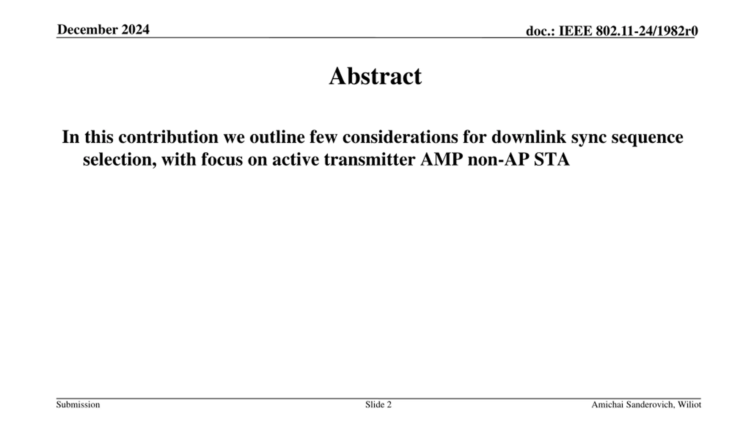 December 2024 doc.: IEEE 802.11-24/1982r0 Abstract In this contribution we outline few considerations for downlink sync sequence selection, with focus on active transmitter AMP non-AP STA Submission Slide 2 Amichai Sanderovich, Wiliot
