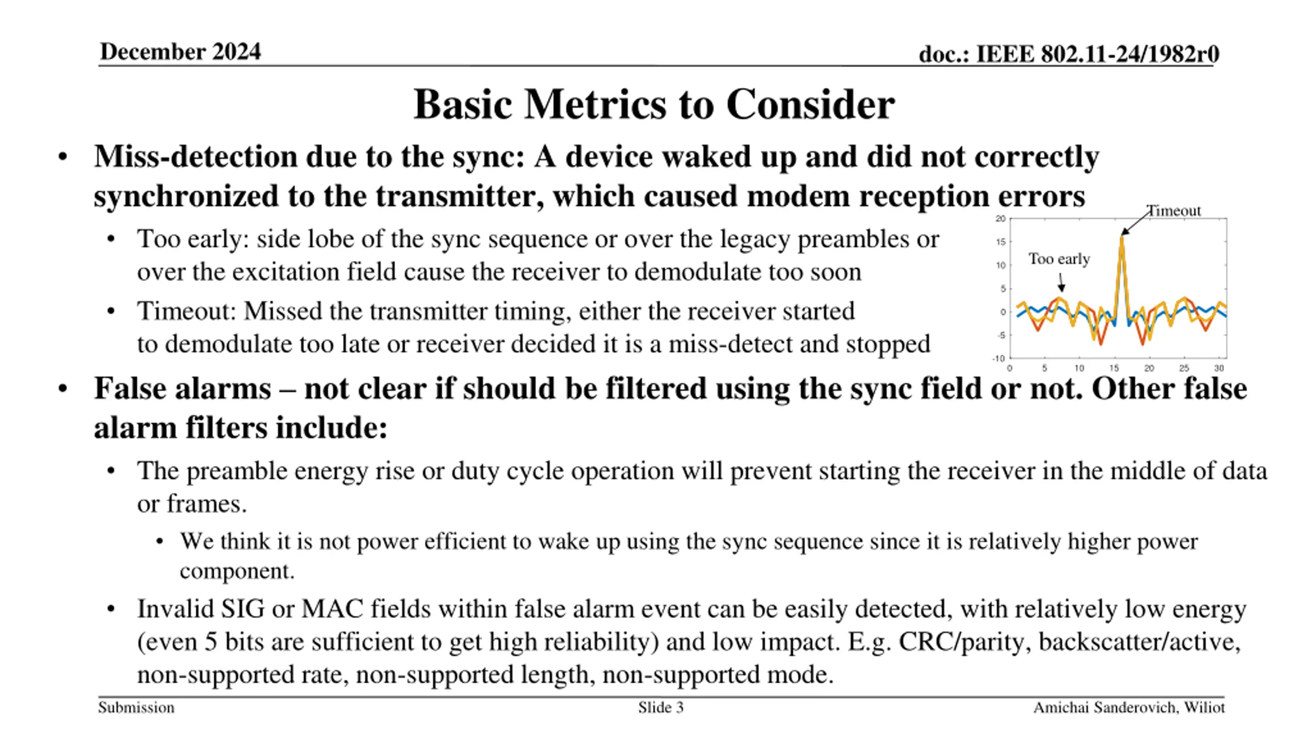December 2024 doc.: IEEE 802.11-24/1982r0 Basic Metrics to Consider Miss-detection due to the sync: A device waked up and did not correctly synchronized to the transmitter, which caused modem reception errors Too early: side lobe of the sync sequence or over the legacy preambles or over the excitation field cause the receiver to demodulate too soon Timeout: Missed the transmitter timing, either the receiver started to demodulate too late or receiver decided it is a miss-detect and stopped False alarms not clear if should be filtered using the sync field or not. Other false alarm filters include: The preamble energy rise or duty cycle operation will prevent starting the receiver in the middle of data or frames. We think it is not power efficient to wake up using the sync sequence since it is relatively higher power component. Invalid SIG or MAC fields within false alarm event can be easily detected, with relatively low energy (even 5 bits are sufficient to get high reliability) and low impact. E.g. CRC/parity, backscatter/active, non-supported rate, non-supported length, non-supported mode. Timeout 20 15 Too early 10 5 0 -5 -10 0 5 10 15 20 25 30 Submission Slide 3 Amichai Sanderovich, Wiliot