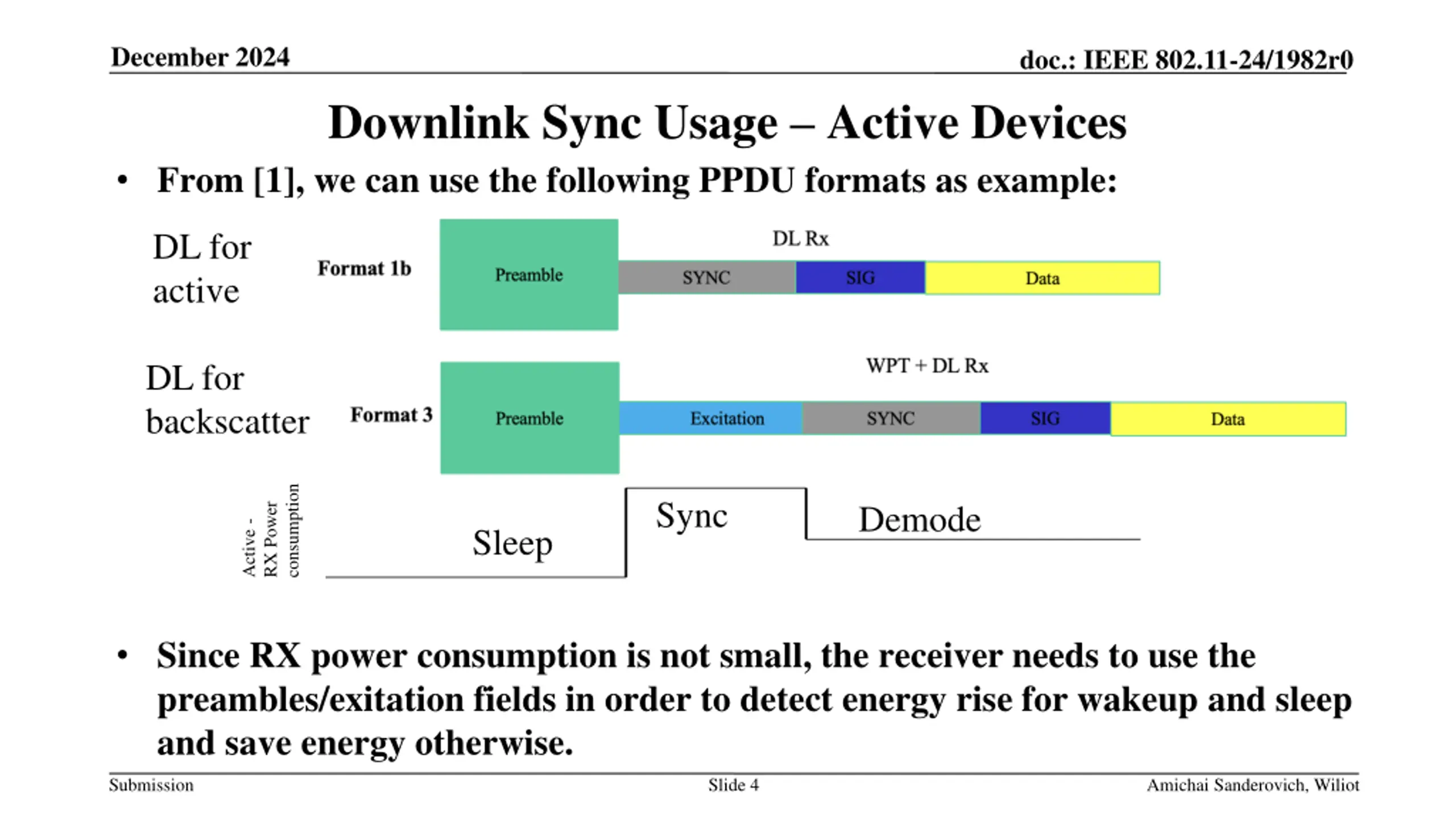 December 2024 doc.: IEEE 802.11-24/1982r0 Downlink Sync Usage Active Devices From [1], we can use the following PPDU formats as example: DL for active DL for backscatter consumption Sync RX Power Demode Active - Sleep Since RX power consumption is not small, the receiver needs to use the preambles/exitation fields in order to detect energy rise for wakeup and sleep and save energy otherwise. Submission Slide 4 Amichai Sanderovich, Wiliot