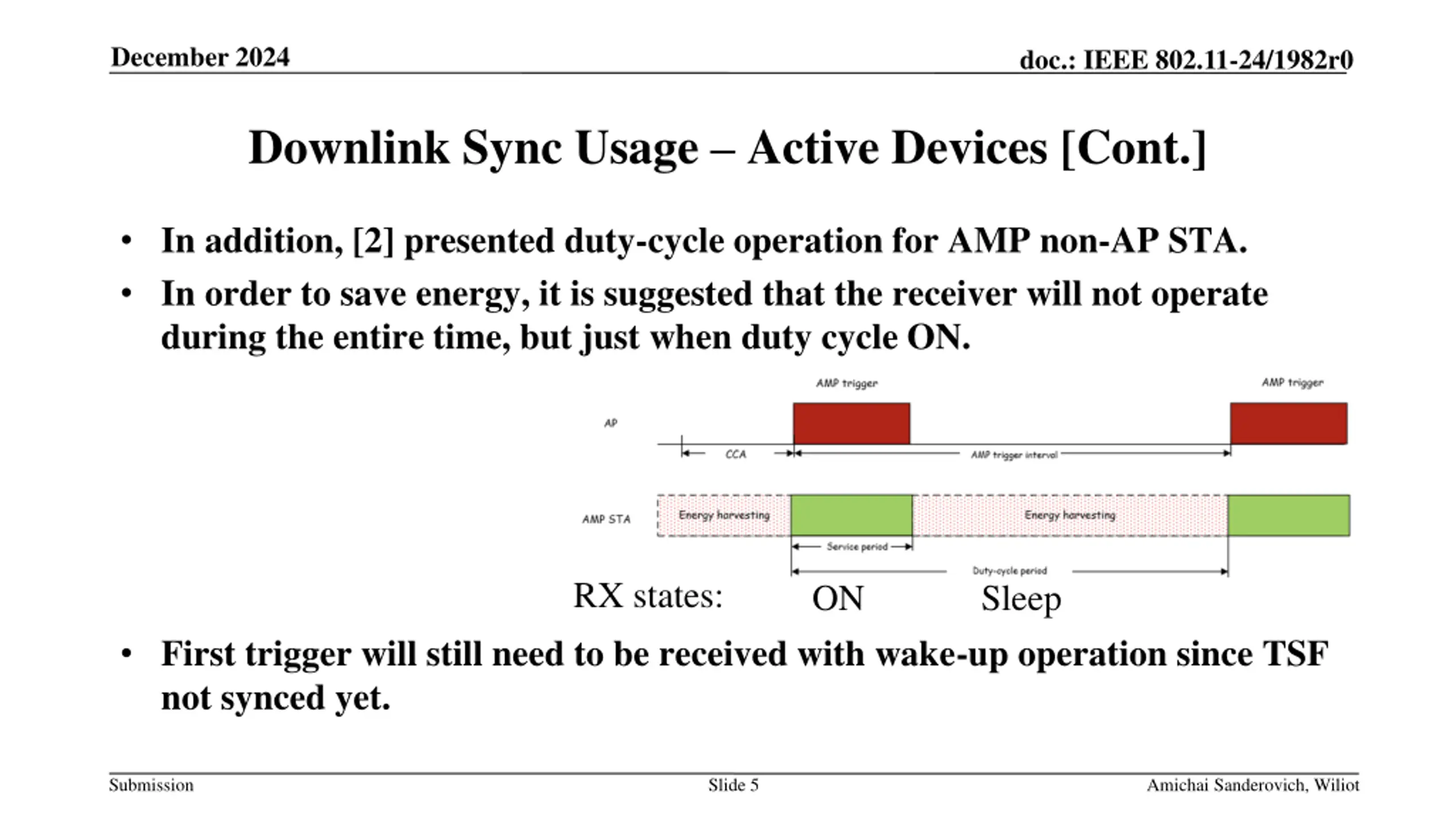 December 2024 doc.: IEEE 802.11-24/1982r0 Downlink Sync Usage Active Devices [Cont.] In addition, [2] presented duty-cycle operation for AMP non-AP STA. In order to save energy, it is suggested that the receiver will not operate during the entire time, but just when duty cycle ON. RX states: ON Sleep First trigger will still need to be received with wake-up operation since TSF not synced yet. Submission Slide 5 Amichai Sanderovich, Wiliot