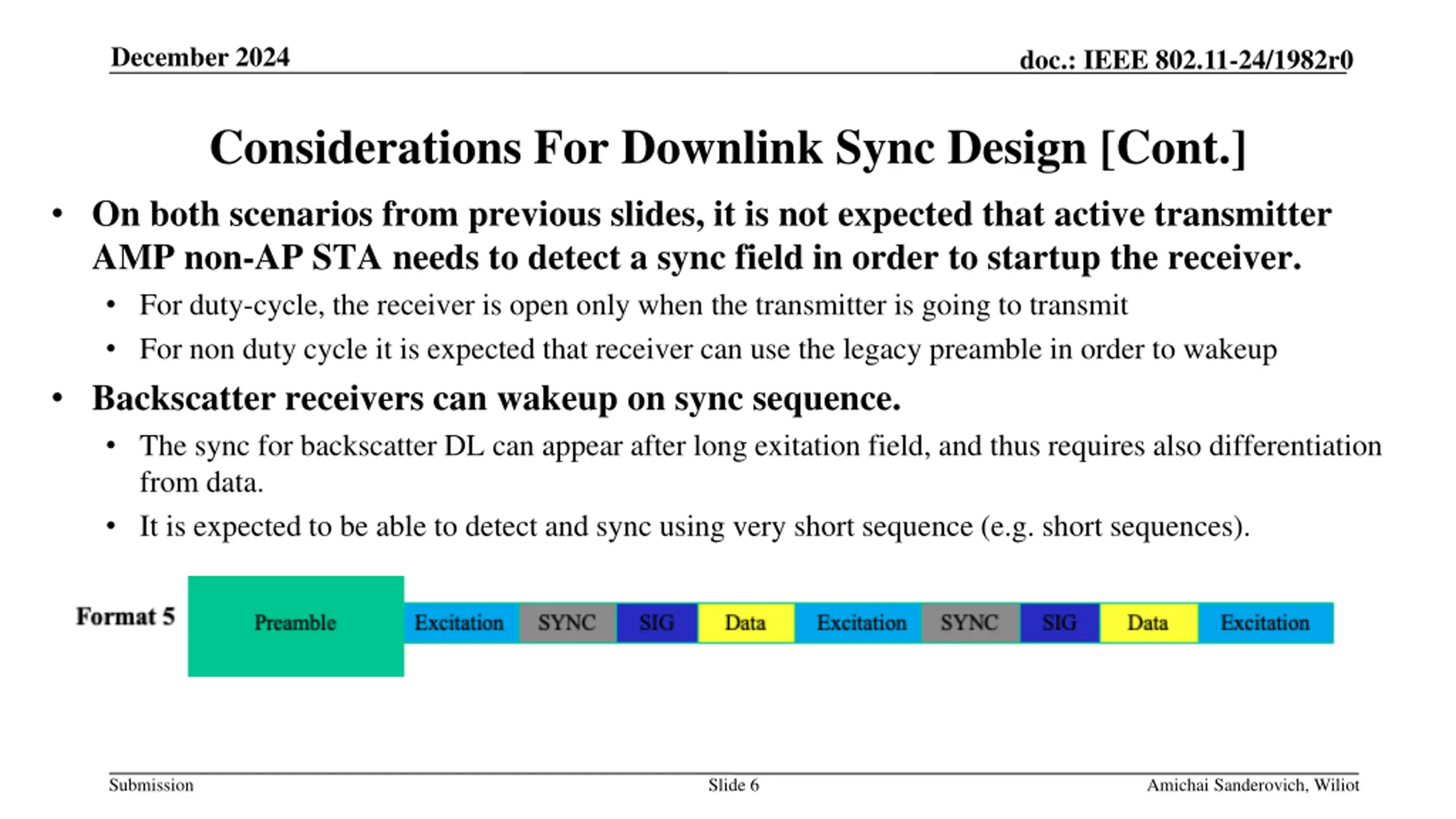 December 2024 doc.: IEEE 802.11-24/1982r0 Considerations For Downlink Sync Design [Cont.] On both scenarios from previous slides, it is not expected that active transmitter AMP non-AP STA needs to detect a sync field in order to startup the receiver. For duty-cycle, the receiver is open only when the transmitter is going to transmit For non duty cycle it is expected that receiver can use the legacy preamble in order to wakeup Backscatter receivers can wakeup on sync sequence. The sync for backscatter DL can appear after long exitation field, and thus requires also differentiation from data. It is expected to be able to detect and sync using very short sequence (e.g. short sequences). Submission Slide 6 Amichai Sanderovich, Wiliot