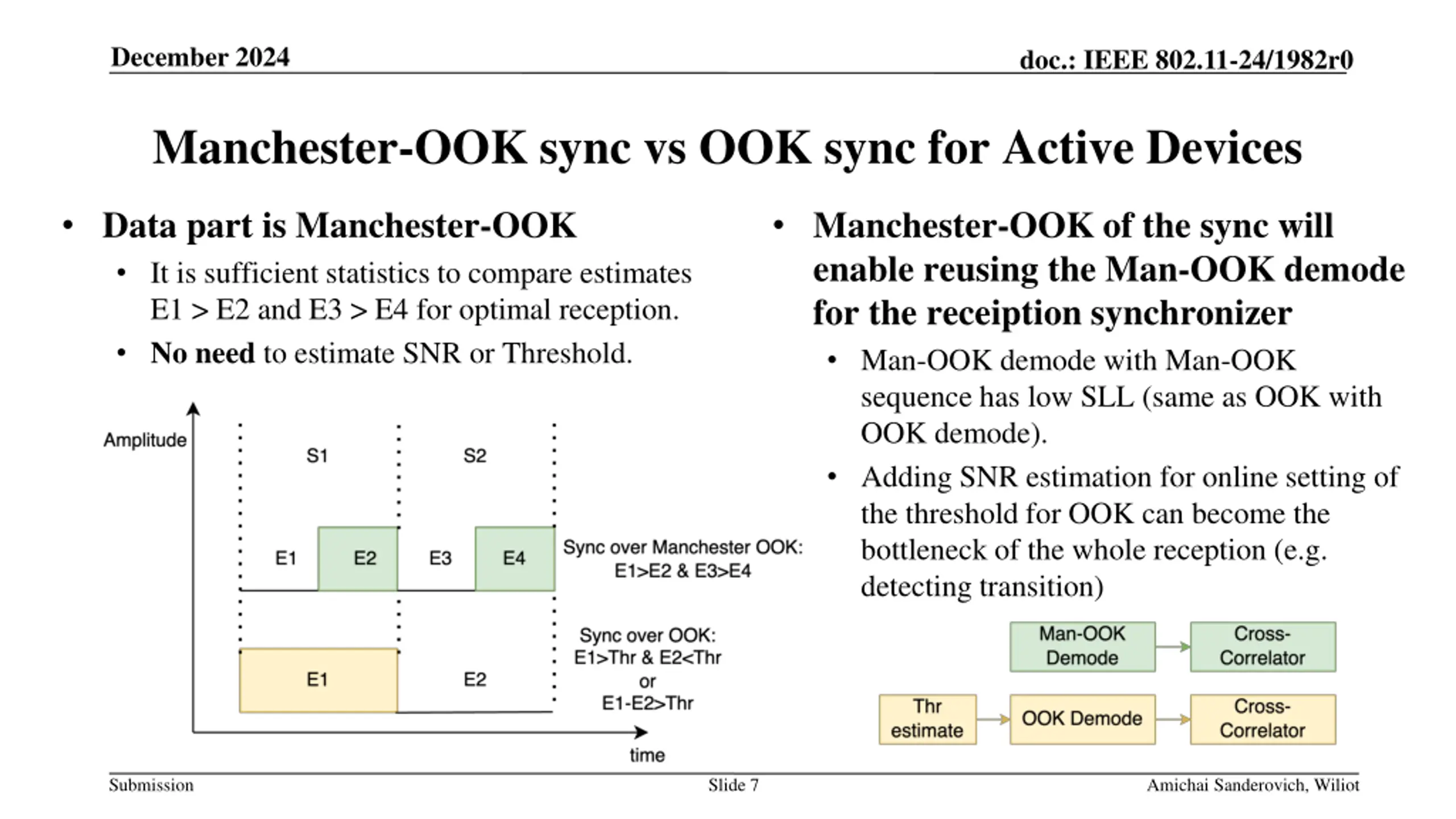 December 2024 doc.: IEEE 802.11-24/1982r0 Manchester-OOK sync vs OOK sync for Active Devices Data part is Manchester-OOK It is sufficient statistics to compare estimates E1 > E2 and E3 > E4 for optimal reception. No need to estimate SNR or Threshold. Manchester-OOK of the sync will enable reusing the Man-OOK demode for the receiption synchronizer Man-OOK demode with Man-OOK sequence has low SLL (same as OOK with OOK demode). Adding SNR estimation for online setting of the threshold for OOK can become the bottleneck of the whole reception (e.g. detecting transition) Submission Slide 7 Amichai Sanderovich, Wiliot