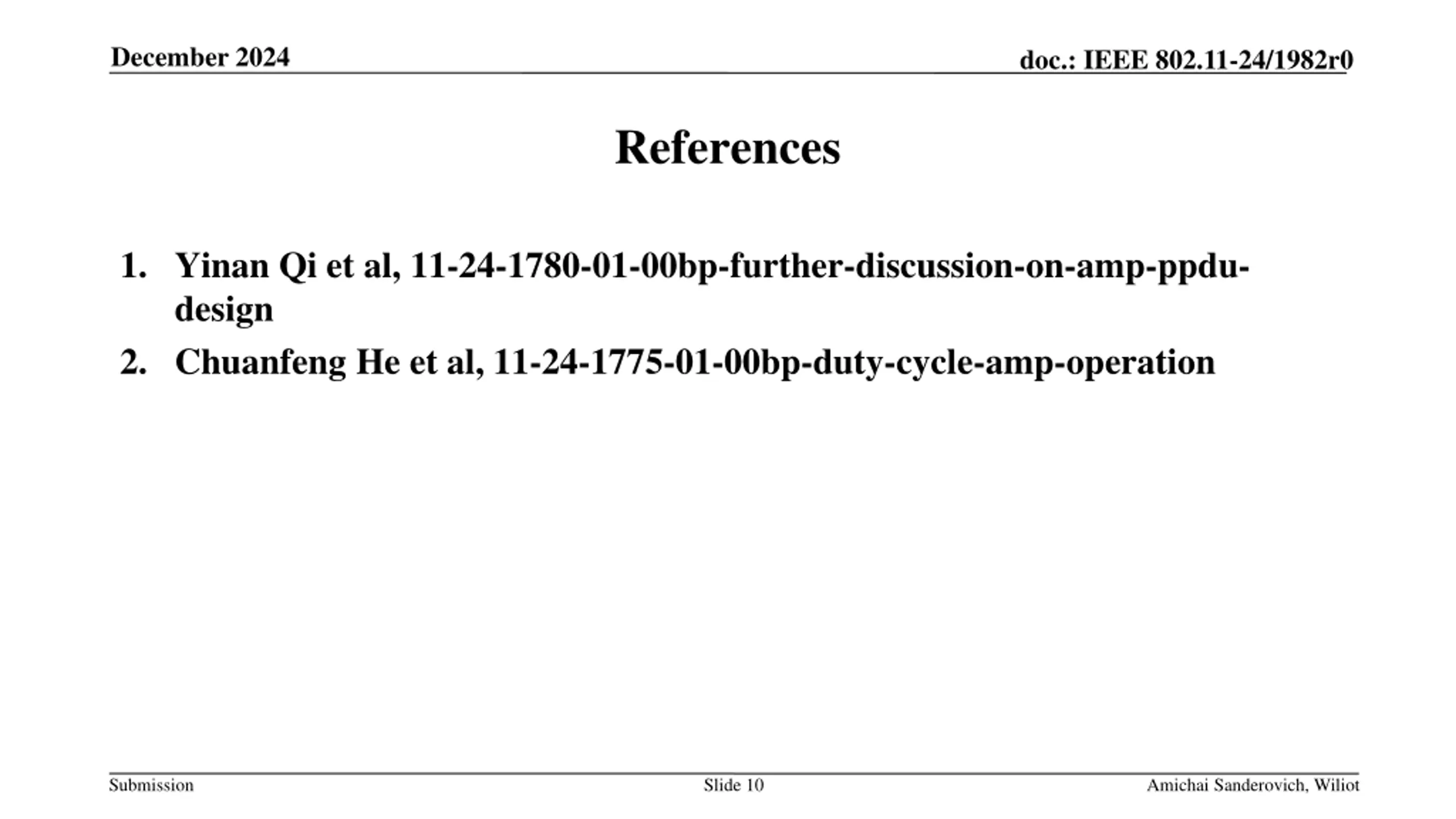 December 2024 doc.: IEEE 802.11-24/1982r0 References 1. Yinan Qi et al, 11-24-1780-01-00bp-further-discussion-on-amp-ppdu- design 2. Chuanfeng He et al, 11-24-1775-01-00bp-duty-cycle-amp-operation Submission Slide 10 Amichai Sanderovich, Wiliot