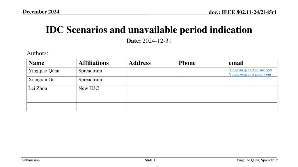 December 2024 doc.: IEEE 802.11-24/2145r1 IDC Scenarios and unavailable period indication Date: 2024-12-31 Authors: Name Yingqiao Quan Affiliations Spreadtrum Address Phone email Yingqiao.quan@unisoc.com Yingqiao.quan@gmail.com Xiangxin Gu Spreadtrum Lei Zhou New H3C Submission Slide 1 Yingqiao Quan, Spreadtrum