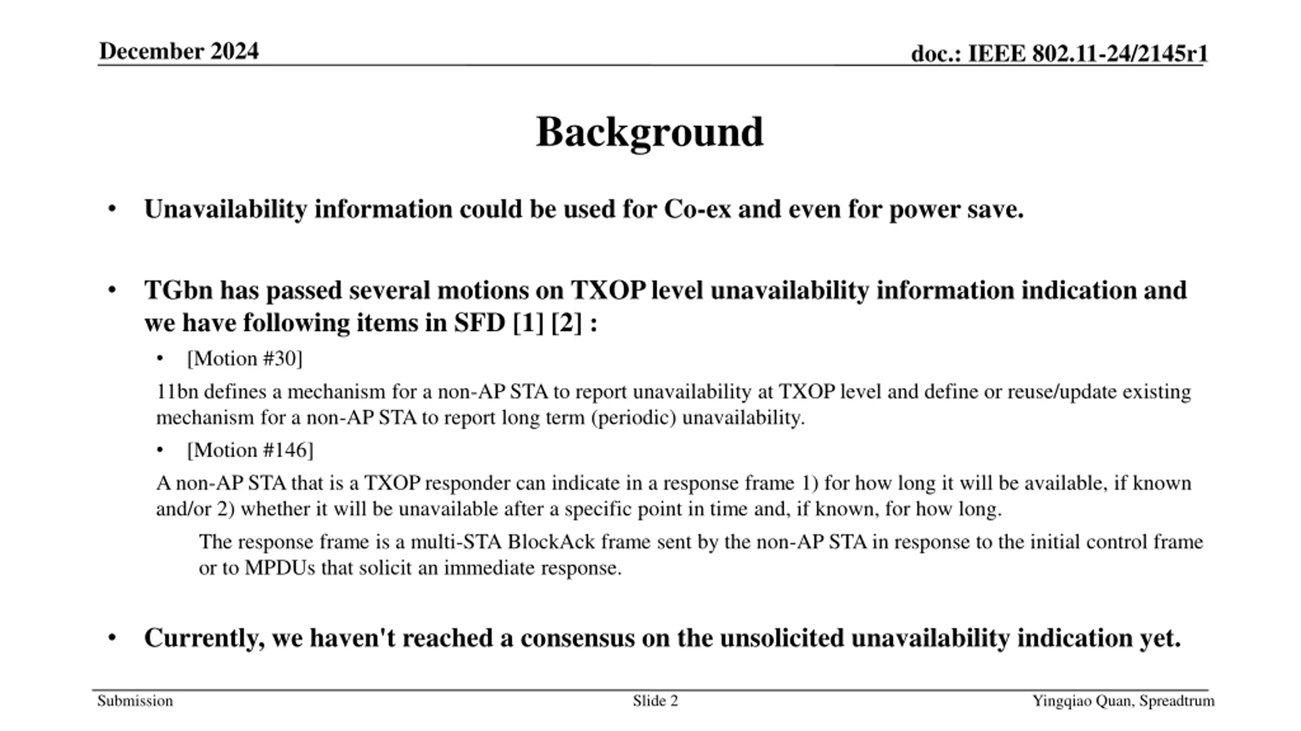 December 2024 doc.: IEEE 802.11-24/2145r1 Background Unavailability information could be used for Co-ex and even for power save. TGbn has passed several motions on TXOP level unavailability information indication and we have following items in SFD [1] [2] : [Motion #30] 11bn defines a mechanism for a non-AP STA to report unavailability at TXOP level and define or reuse/update existing mechanism for a non-AP STA to report long term (periodic) unavailability. [Motion #146] A non-AP STA that is a TXOP responder can indicate in a response frame 1) for how long it will be available, if known and/or 2) whether it will be unavailable after a specific point in time and, if known, for how long. The response frame is a multi-STA BlockAck frame sent by the non-AP STA in response to the initial control frame or to MPDUs that solicit an immediate response. Currently, we haven't reached a consensus on the unsolicited unavailability indication yet. Submission Slide 2 Yingqiao Quan, Spreadtrum