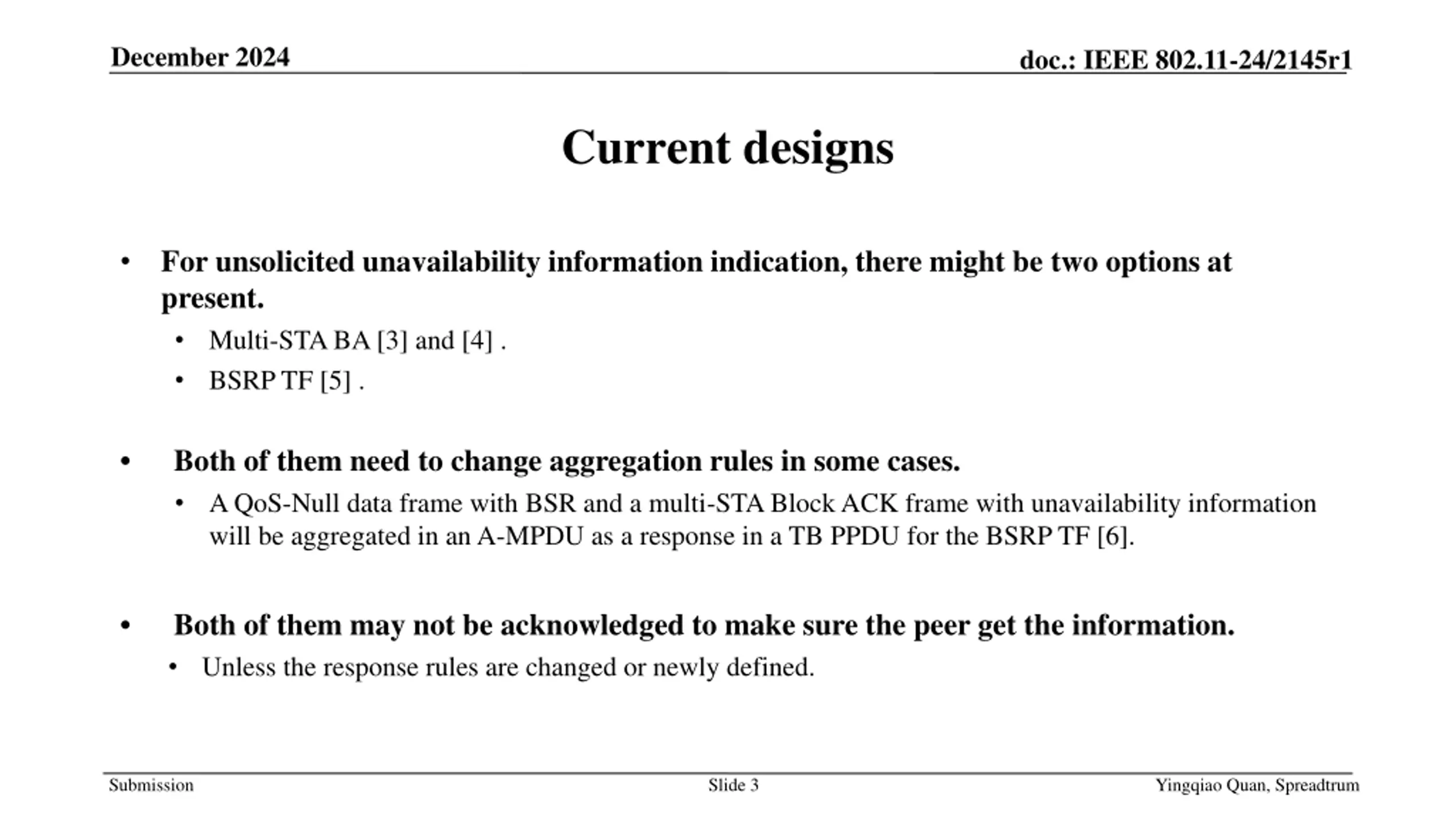 December 2024 doc.: IEEE 802.11-24/2145r1 Current designs For unsolicited unavailability information indication, there might be two options at present. Multi-STA BA [3] and [4] . BSRP TF [5] . Both of them need to change aggregation rules in some cases. A QoS-Null data frame with BSR and a multi-STA Block ACK frame with unavailability information will be aggregated in an A-MPDU as a response in a TB PPDU for the BSRP TF [6]. Both of them may not be acknowledged to make sure the peer get the information. Unless the response rules are changed or newly defined. Submission Slide 3 Yingqiao Quan, Spreadtrum