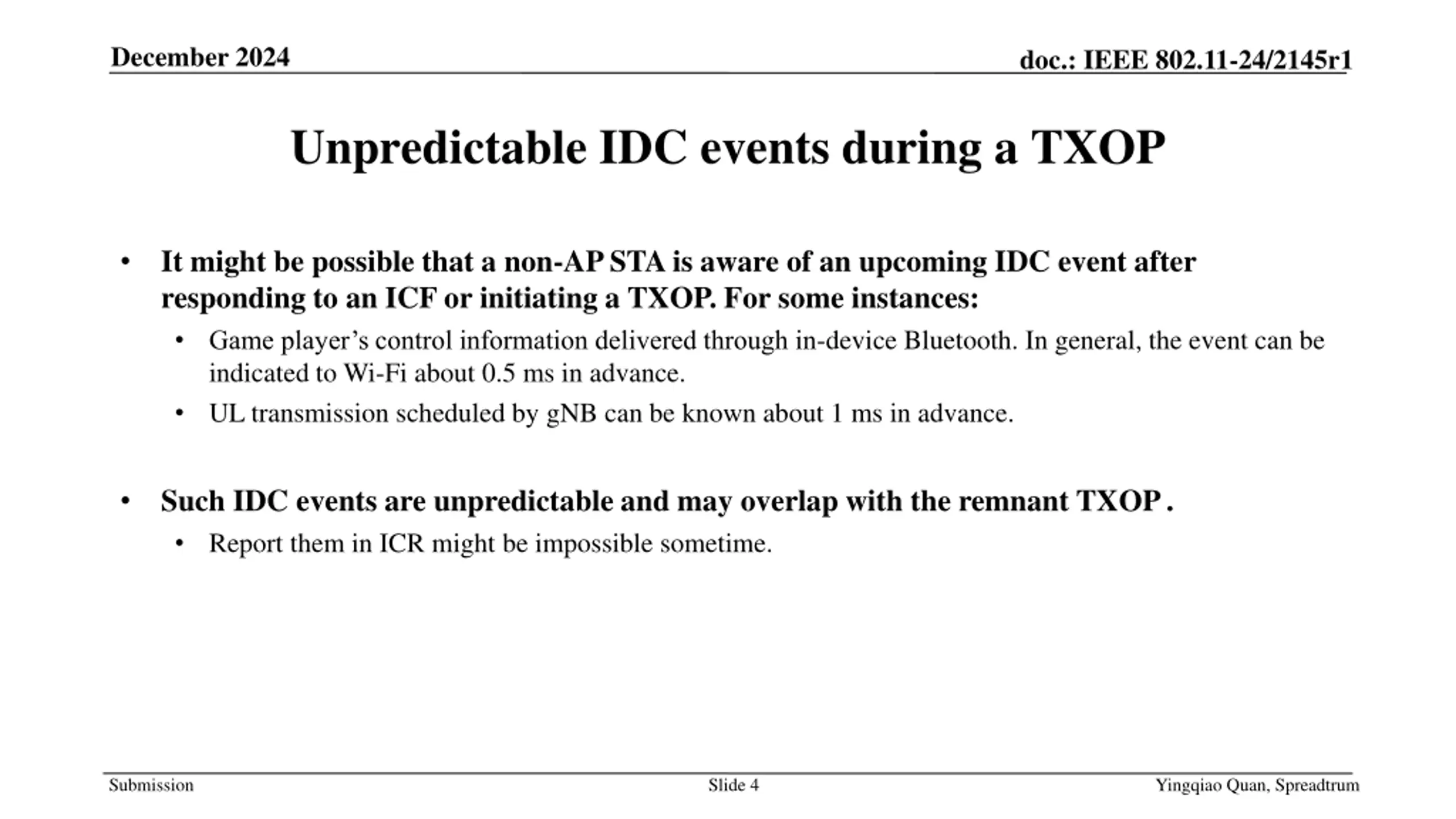 December 2024 doc.: IEEE 802.11-24/2145r1 Unpredictable IDC events during a TXOP It might be possible that a non-AP STA is aware of an upcoming IDC event after responding to an ICF or initiating a TXOP. For some instances: Game player s control information delivered through in-device Bluetooth. In general, the event can be indicated to Wi-Fi about 0.5 ms in advance. UL transmission scheduled by gNB can be known about 1 ms in advance. Such IDC events are unpredictable and may overlap with the remnant TXOP . Report them in ICR might be impossible sometime. Submission Slide 4 Yingqiao Quan, Spreadtrum