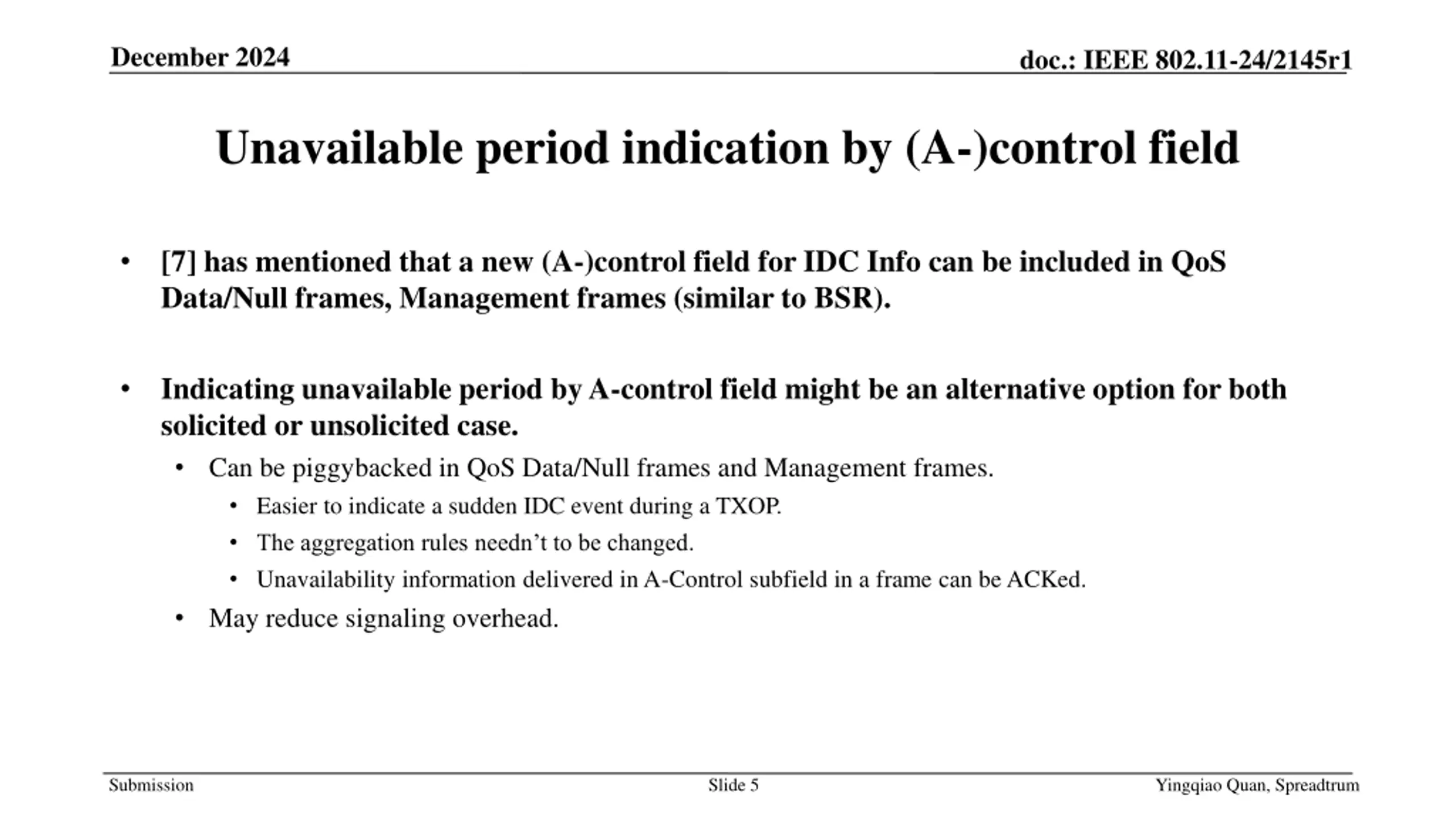 December 2024 doc.: IEEE 802.11-24/2145r1 Unavailable period indication by (A-)control field [7] has mentioned that a new (A-)control field for IDC Info can be included in QoS Data/Null frames, Management frames (similar to BSR). Indicating unavailable period by A-control field might be an alternative option for both solicited or unsolicited case. Can be piggybacked in QoS Data/Null frames and Management frames. Easier to indicate a sudden IDC event during a TXOP. The aggregation rules needn t to be changed. Unavailability information delivered in A-Control subfield in a frame can be ACKed. May reduce signaling overhead. Submission Slide 5 Yingqiao Quan, Spreadtrum