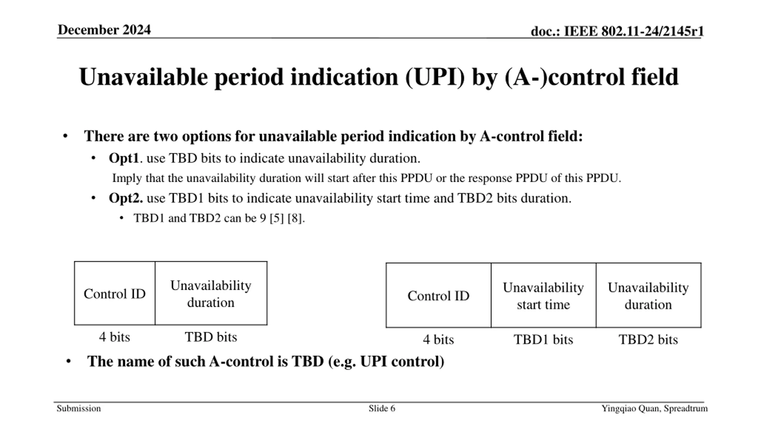 December 2024 doc.: IEEE 802.11-24/2145r1 Unavailable period indication (UPI) by (A-)control field There are two options for unavailable period indication by A-control field: Opt1. use TBD bits to indicate unavailability duration. Imply that the unavailability duration will start after this PPDU or the response PPDU of this PPDU. Opt2. use TBD1 bits to indicate unavailability start time and TBD2 bits duration. TBD1 and TBD2 can be 9 [5] [8]. Unavailability duration Unavailability start time Unavailability duration Control ID Control ID 4 bits The name of such A-control is TBD (e.g. UPI control) TBD bits 4 bits TBD1 bits TBD2 bits Submission Slide 6 Yingqiao Quan, Spreadtrum